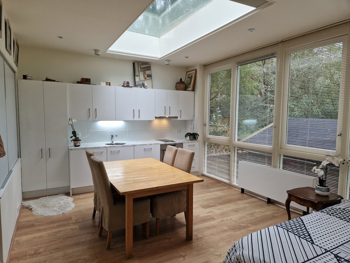 Studio privé avec entrée privée dans le sud d'Amsterdam (Buitenveldert) avec jardin, en face de la forêt d'Amsterdam. Salle de bain privée avec douche et toilettes. Cuisine ouverte avec lave-vaisselle, four, réfrigérateur, cuisinière avec hotte. Proche de la gare d'Amsterdam Zuid et de la station de métro Amstelveenseweg avec de bonnes liaisons (environ 10 minutes) vers le centre-ville et l'aéroport de Schiphol. Les bus s'arrêtent presque devant la porte et vont au centre-ville d'Amsterdam et à Amstelveen. Les voyageurs sont autorisés à utiliser notre grand jardin. Wifi gratuit.