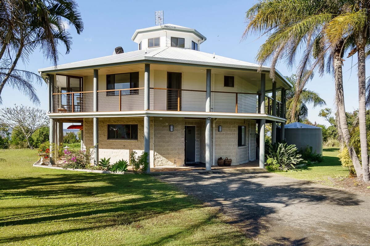 Notre maison ronde est située sur une superficie côtière rurale, au bord du détroit de Great Sandy, surplombant l'île Fraser et les magnifiques eaux bleues de cette région. Récemment rénovée et très confortable, nous proposons trois chambres : la chambre principale Queen à l'étage dispose de la climatisation, de la télévision et d'une salle de bains privative tandis qu'en bas se trouvent la chambre Queen et la chambre à deux lits avec la salle de bains commune. Vous y trouverez également des toilettes séparées à l'étage. Les autres espaces dont vous pouvez profiter sont le salon, la salle à manger, le barbecue, le coin lecture et la terrasse.