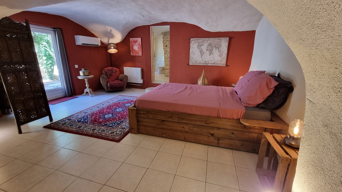 Suite de caractère situé entre Nîmes et Montpellier et à 30 min des plages. Complètement dédié à l’évasion, au repos et à la relaxation. Vous y trouverez tout le confort, un lit baldaquin queen, un vrai Jacuzzi américain 3 places, une cheminée électrique, une Tv 55', un canapé-lit, wifi et Netflix. Dans la sale de bain, vous trouverez une double vasque ainsi qu une douche. Dans la cuisine, vous trouverez le nécessaire pour réchauffer vos plats. Inclus place privé.