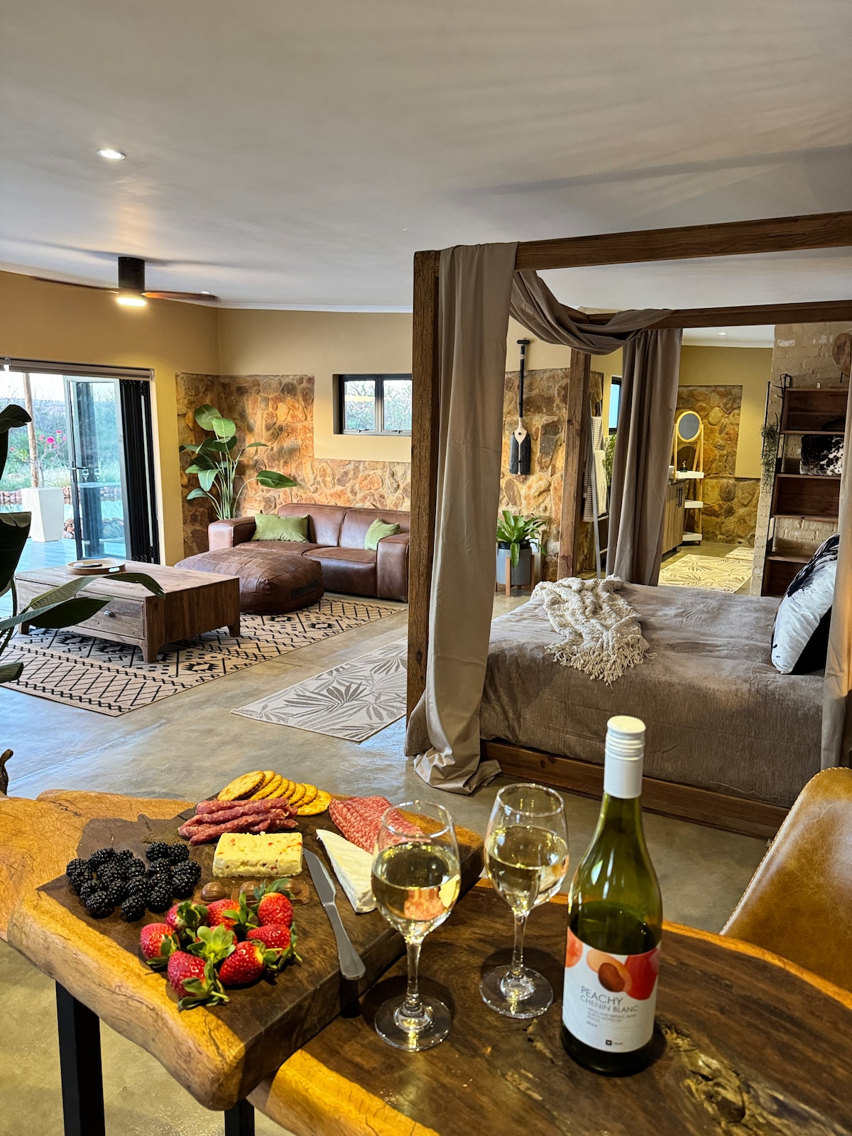 Un chalet en pierre enchanté à Mpumalanga situé dans un cadre de ferme magique, entouré d'arbres géants animés par le chant des oiseaux. À 3 heures de route de Johannesburg. À 45 minutes de Mbombela, Nelspruit. À 15 minutes de Ngodwana. Un emplacement idéal pour des promenades dans la nature, des baignades dans la rivière et des apéritifs au coucher du soleil. Savourez vos soirées devant le feu avec une douce berceuse chantée par des hiboux hululants. Récupérez vos œufs frais de la ferme chez Matilda 🐔 et dégustez votre café dans le potager 👩🌾 d'Ebba.
