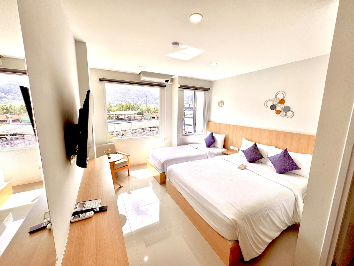 Suite familiale Junior de 44 m ² (5,5 x 8 m ²) située au 3e étage dispose d'un lit queen size, de deux matelas queen size, petit déjeuner inclus, télévision connectée 55"avec Netflix gratuit, placard, réfrigérateur, eau potable, sèche-cheveux, lisseur, canapé, bureau, salle de douche séparée avec douche à effet pluie et toilettes avec chasse d'eau WC, articles de toilette, serviettes, linge de maison, Wi-Fi gratuit dans toute la zone, accès au coin Happy Camper. « Un chez-soi », bien que vous soyez absent à Krabi.