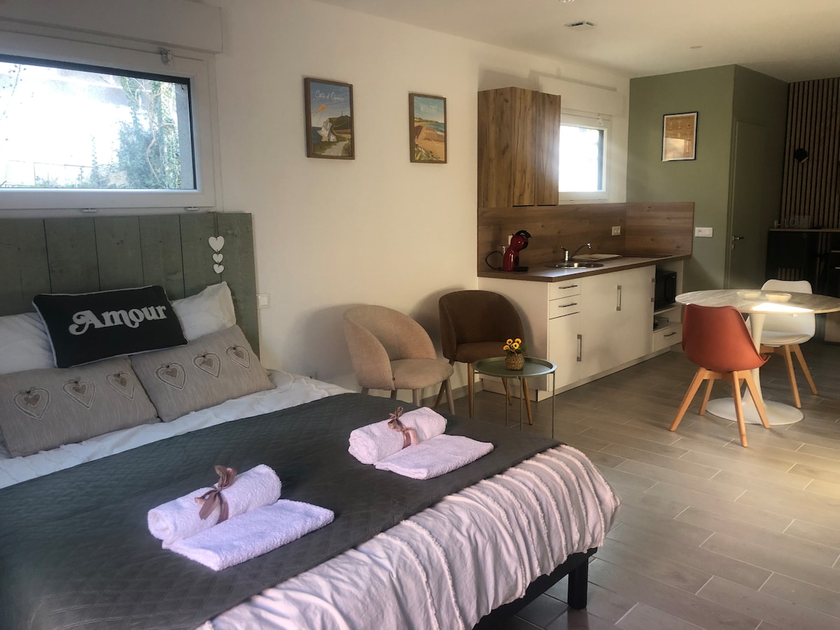 Venez profiter le temps d'une nuit ou d'un weekend, d'un spa privatif ! Vous serez séduit par ce logement de charme de plus de 40m2, entièrement neuf. Il est composé d'un espace salon avec baignoire balneo et sauna, d'une cuisine équipée, d'une chambre avec lit Queen size et écran plat (Netflix, prime vidéo), d'une salle de bain avec douche italienne et de WC séparé. Un joli espace extérieur avec terrasse vous attend.