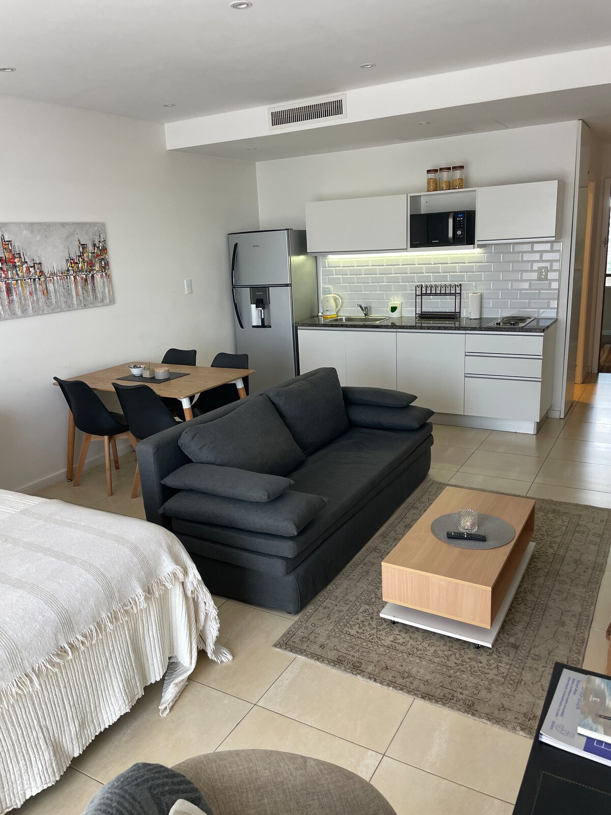 Profitez d'un studio au design moderne, spacieux et fonctionnel de 40 m. Situé dans la tranquille baie de Nordelta (Rincón de Milberg). Cet appartement à l'esthétique contemporaine combine une disposition intelligente avec des équipements haut de gamme : Canapé confortable qui peut également servir de lit supplémentaire. Un lit spacieux et lumineux pour un sommeil réparateur. Cuisine intégrée entièrement équipée - réfrigérateur, micro-ondes, grille-pain, cafetière et ustensiles divers. Internet et parking haut de gamme.