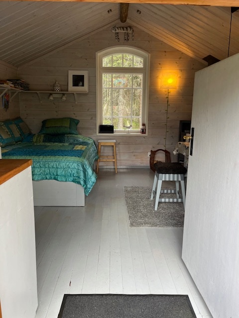 Petit chalet d'été charmant avec propriété lacustre. Ici, vous pourrez profiter du soleil tôt le matin et tard le soir. Un endroit calme et paisible avec une jetée privée et un bateau sont disponibles à l'emprunt. Il y a une douche et des toilettes dans le gîte. Dans la chambre, vous vous détendez confortablement avec des vues magiques. Sur la terrasse vitrée, il y a des canapés confortables et une grande table à manger pour les soirées de fin d'été. À 6 km du terrain de golf de Puttom Excursion destination Skeppsmalen Lotsstigen Salusands havsbad Norrbyskär Höga kusten