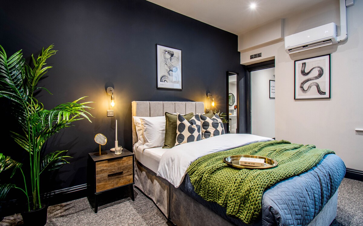 Une palette neutre de crèmes et de bruns et de gris doux colore les murs, mélangés à du papier peint élégant avec des murs et de beaux draps. De délicieuses tables et chaises s'adaptent parfaitement à l'appartement, avec une télévision intelligente agencée pour une vue facile à partir du lit double confortable. De là, vous pourrez rejoindre facilement la cuisine de l'appartement équipée avec goût. Aucune ampoule n'est trop lumineuse et il n'y a pas de frisson indésirable, tout l'est tout simplement, comme on le trouverait dans la maison d'un membre de la famille fier de la maison, y compris le Wi-Fi partout! La salle de bains élégante avec son élégant miroir doré, son mur en mosaïque et sa grande douche électrique et ses articles de toilette gratuits, est complétée par la lumière naturelle de la fenêtre.