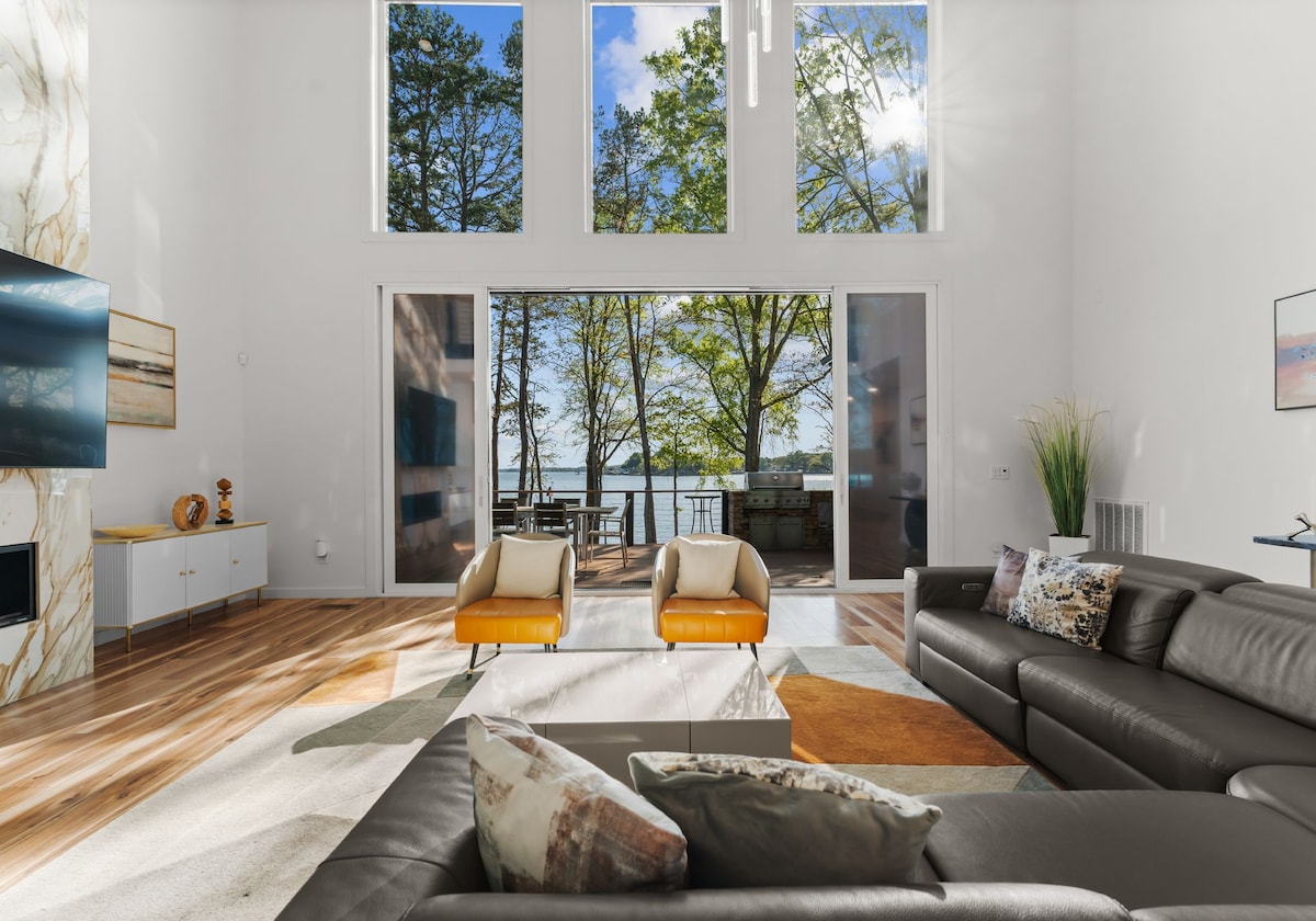 Maison de lac moderne des années 1960 rénovée avec amour, avec une vue imprenable sur le canal principal et une eau de 15 pieds de profondeur au large du quai privé. Profitez de plus de 4000 pieds carrés de vie au bord du lac en famille et entre amis sur une belle propriété fermée. Beaucoup d'espace de vie extérieur avec terrasse à plusieurs niveaux et un coin repas et barbecue extérieur. À seulement 35 minutes de l'aéroport international de Charlotte-Douglas. Amarrage de bateau sur la propriété, en plus d'un accès facile à une descente publique ou à des locations de bateaux à proximité.