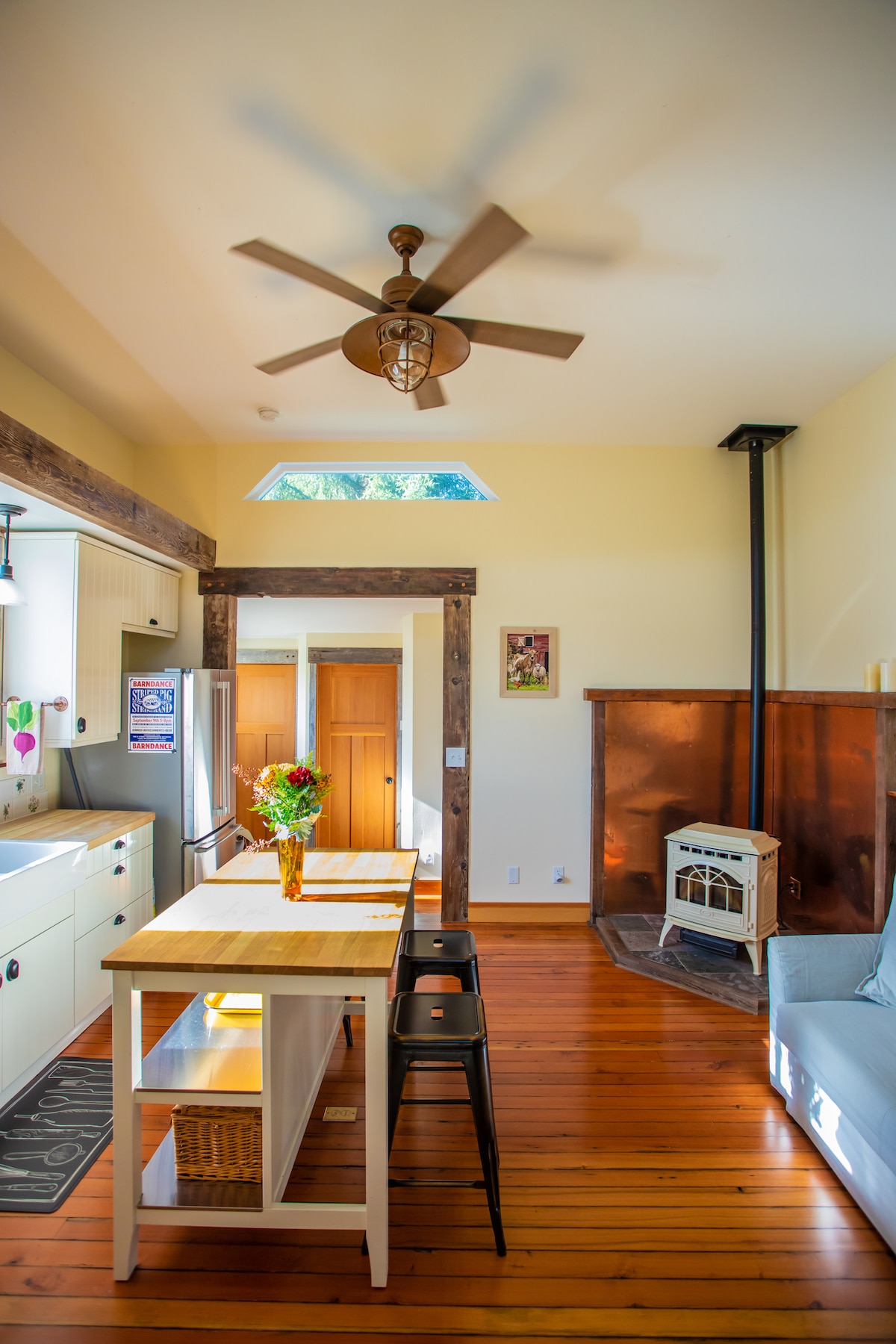 Beautiful, private, 648 sq foot 2-floor studio with ocean views, 2 miles north of Gualala across from Cooks Beach, above and beside a garage behind the main house. This is a cozy but stunning space, with three big, brand-new skylights providing ocean views, amazing light, and views from every window. The lower full bath and kitchen / dining room lets out to small private patio and attached small greenhouse with citrus trees and herbs, with fenced garden and clearing with ocean views nearby.