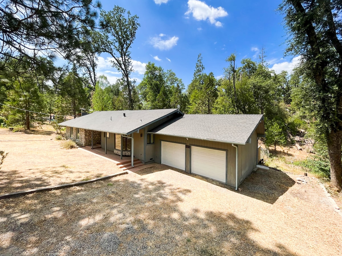 Bienvenue ! Située à 20 miles de l'entrée sud du parc national de Yosemite et à 2 miles du lac Bass, notre maison moderne récemment rénovée est nichée sur 1 acre dans un quartier calme et isolé avec vue sur les prairies et un ruisseau saisonnier. Dotée d'un décor confortable et accueillant, d'une cuisine bien approvisionnée, du chauffage et de la climatisation, du WIFI, d'une entrée sans clé, d'un parking sur place et d'une cour privée avec vue sur la forêt.