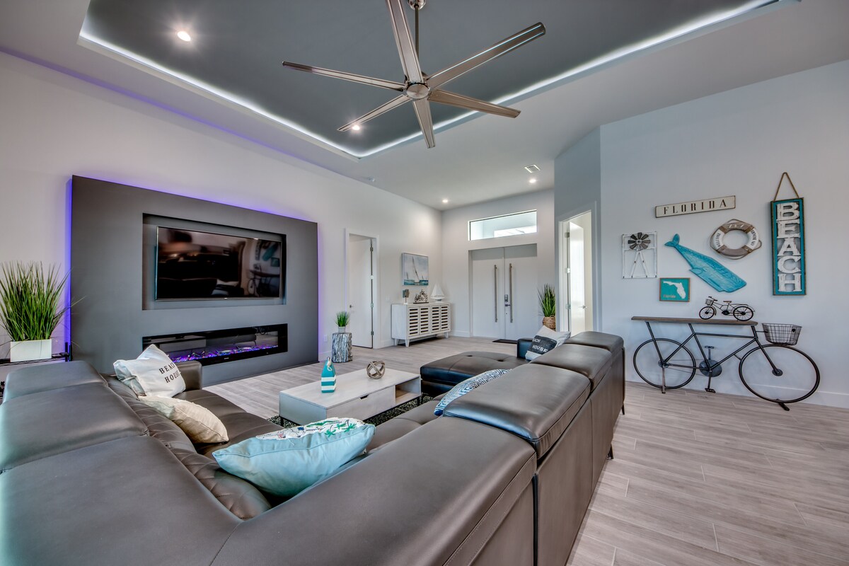 Belle maison moderne de NOUVELLE construction avec piscine chauffée, sur le canal d'eau salée. Sans dommage après l'ouragan Milton. AMUSANTE pour les familles et tranquille pour les adultes ; entièrement équipée avec table de jeux électroniques, jouets et flotteurs de piscine, jeux d'extérieur, jeux d'arcade, jeux de société — beaucoup à apprécier ! Profitez de la vie intérieure/extérieure sur une grande véranda de style resort et retirez-vous dans des finitions élégantes et des équipements de luxe partout !