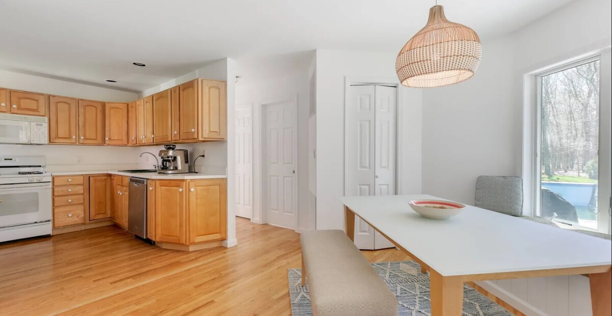 Évadez-vous dans votre oasis chic et sereine des Hamptons ! Profitez de l'intimité de votre propre maison, à quelques pas de restaurants au bord de l'eau et bien plus encore Détendez-vous au bord de la piscine, allumez le barbecue + le foyer sous le ciel étoilé, nagez + profitez du calme + de la tranquillité de ce logement. Profitez d'un cadre de vie simple et de commodités ; à 1 pâté de maisons à pied de restaurants et de cafés au bord de l'eau. Savourez des cocktails en admirant des couchers de soleil magnifiques + prenez votre café du matin au bord de la mer. Diffusez du contenu sur votre télévision 80” Vous serez à 8 minutes de Main St, des commerces, des plages, des restaurants et bien plus encore !