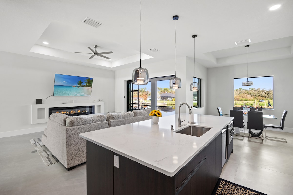 Le salon dispose d'une télévision intelligente de 65 pouces, murale avec un foyer LCD en dessous avec son surround. Toutes les téléviseurs ont Netflix. La salle de bar dispose d'un petit réfrigérateur, d'une table de billard et d'un jeu de fléchettes. À l'extérieur, il y a un lanai privé avec piscine chauffée et un foyer au propane. Profitez du son Sonos avec une télévision intelligente de 55 pouces dans la chambre principale. La deuxième chambre dispose également d'une télévision. La salle de bar dispose également de sonos ainsi que la véranda. À 30 minutes de plusieurs plages. Le garage ne sera pas disponible. Maison située dans un cul de sac calme.