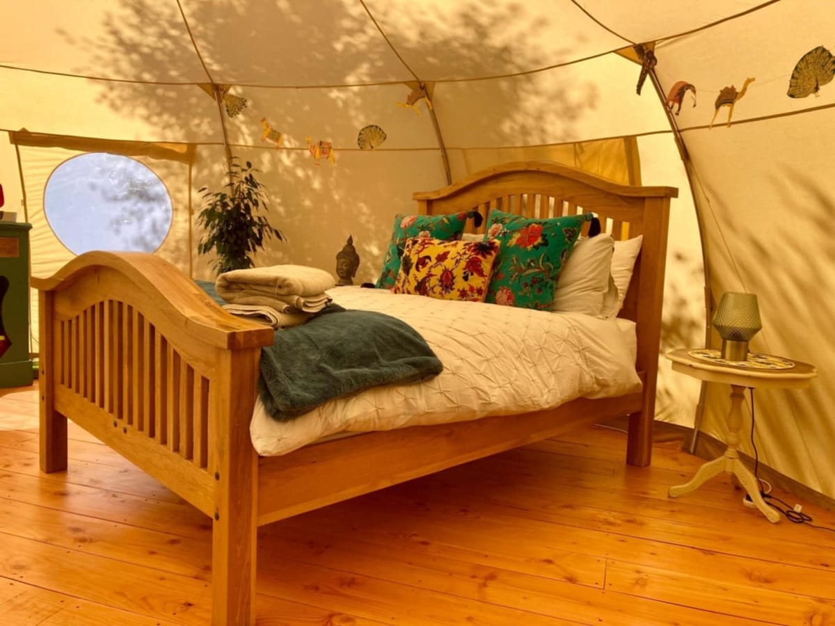 Tente confortable avec lit king size, brasero et vue imprenable sur la campagne à Sychpwll. Notre tente en forme de cloche de 5 m est située dans un emplacement de camping privé. À l'intérieur se trouvent un lit king size super confortable, des tapis et deux chaises pour un séjour reposant. À l'extérieur, profitez d'un barbecue et d'un coin feu avec un banc de pique-nique. Les voyageurs ont également accès à une cuisine commune et à des toilettes et douches avec des douches chaudes dans le complexe de bâtiments en ballots de paille. Sychpwll a également un accès direct à la rivière.