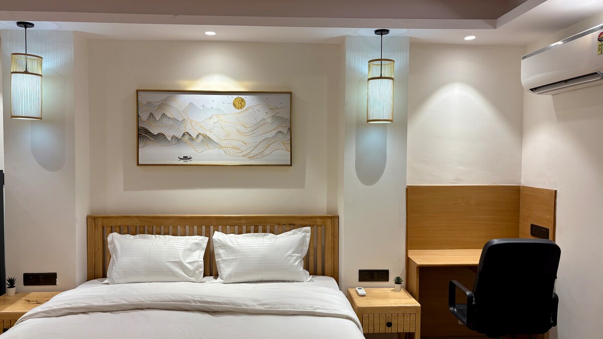 Bienvenue à Sadharan Homestays ! Notre studio privé à Kailash Hills offre un séjour de luxe, parfait pour des séjours paisibles en famille et amicaux. Les fêtes bruyantes ne sont pas autorisées. Situé au 4e étage sans ascenseur, notre personnel 24h/24 et 7j/7 aide avec les bagages et plus encore. Cuisinez comme un pro dans une cuisine entièrement équipée, ou faites vos courses et appelez notre cuisinier pour des repas chaleureux. Profitez d'une douche thérapeutique avec pluie, cascade, colonne, brume et vapeur. Économisez 18 % sur les réservations d'entreprise avec la facture de TPS !