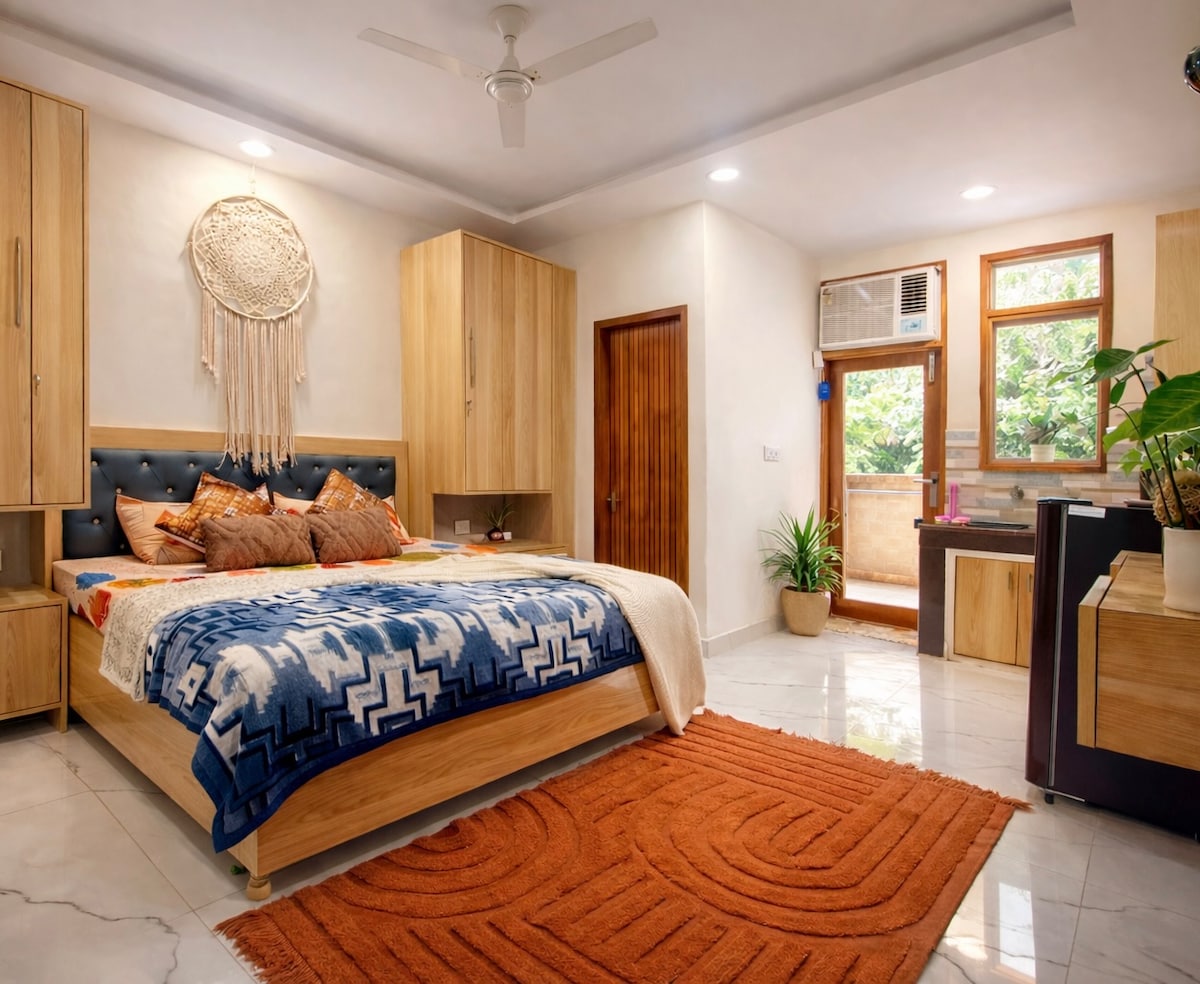 Séjournez dans notre spacieuse retraite de 2 chambres avec vue sur le parc, à 8,5 km des aéroports et à 15 min en voiture du métro. Profitez de balcons aérés, de vues sur le parc, de lits en acajou/bois, d'une cuisine entièrement équipée, d'une connexion Wi-Fi haut débit, d'une télévision connectée, d'articles de toilette gratuits et de recommandations locales. Savourez des repas faits maison, explorez le marché et les centres commerciaux à proximité et détendez-vous sur les pistes de jogging sereines. Découvrez une hospitalité haut de gamme avec une arrivée et un départ flexibles, des services de blanchisserie et des transferts aéroport en option. Réservez dès maintenant pour un séjour inoubliable à Delhi !