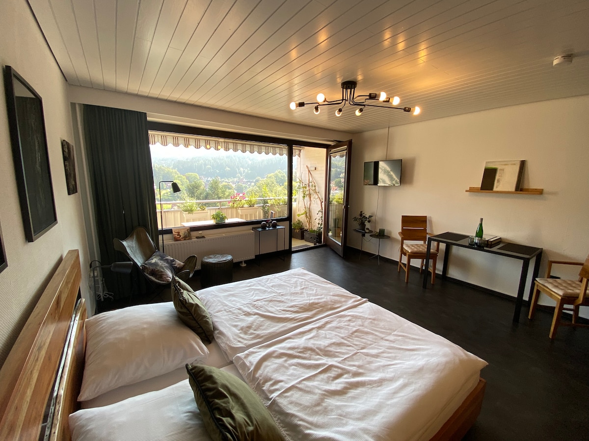 Ihr verbringt Euren Urlaub in unserem 2021 renovierten Appartement im 7. Stock (Fahrstuhl vorhanden) eines ehemaligen Hotels. Durch das Panoramafenster habt Ihr eine herrliche Aussicht auf die Berge und den Luftkurort Bad Grund. Das Appartement verfügt über eine Einbauküche, einen Eßbereich, ein modernes Badezimmer mit großer Dusche, sowie einem gemütlichen Massivholzdoppelbett mit Baumwollbettwäsche. Auf dem Balkon sitzt Ihr zwischen Kräutern ( zum selbst ernten) & Blumen auf Teakholzmöbeln.
