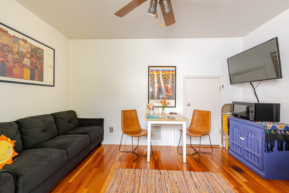 Studio moderne. Design réfléchi. Super confortable et propre. Conforts, lits et literie européens, et dernière technologie dans un quartier calme. Télévision 50" avec streaming, Internet haut débit et Ethernet. Kitchenette avec micro-ondes, grille-pain et Keurig. Salle de bain avec douches à effet pluie et à main, bidet. Installation d'éclairage amusante dans la douche. Dans un bon quartier calme et bordé d'arbres, à 2 pâtés de maisons du centre-ville. Une excellente base pour une excursion d'une journée au Grand Canyon et à Sedona !