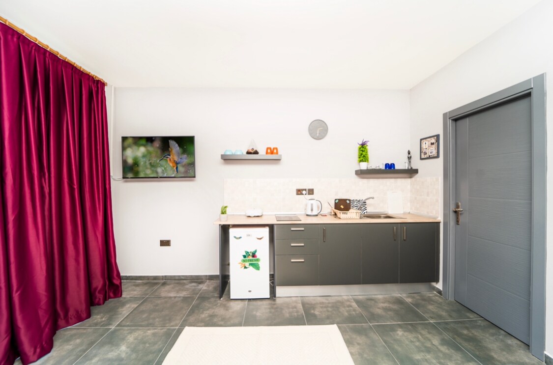 Room is nestled in the foothills of Kyrenia mountains which overlooks a local vineyard. Rooms have access to small gardens in front of them and the property features an infinity swimming pool. It offers AC and self-catered rooms with free Wi-Fi, with balconies overlooking the Mediterranean Sea. Room has a double bed and a private bathroom. Featuring a kitchenette with fridge, cooking hobs, kettle, and toaster. Satellite TV , NETFLIX and include a seating area for breakfast, lunch, or dinner.