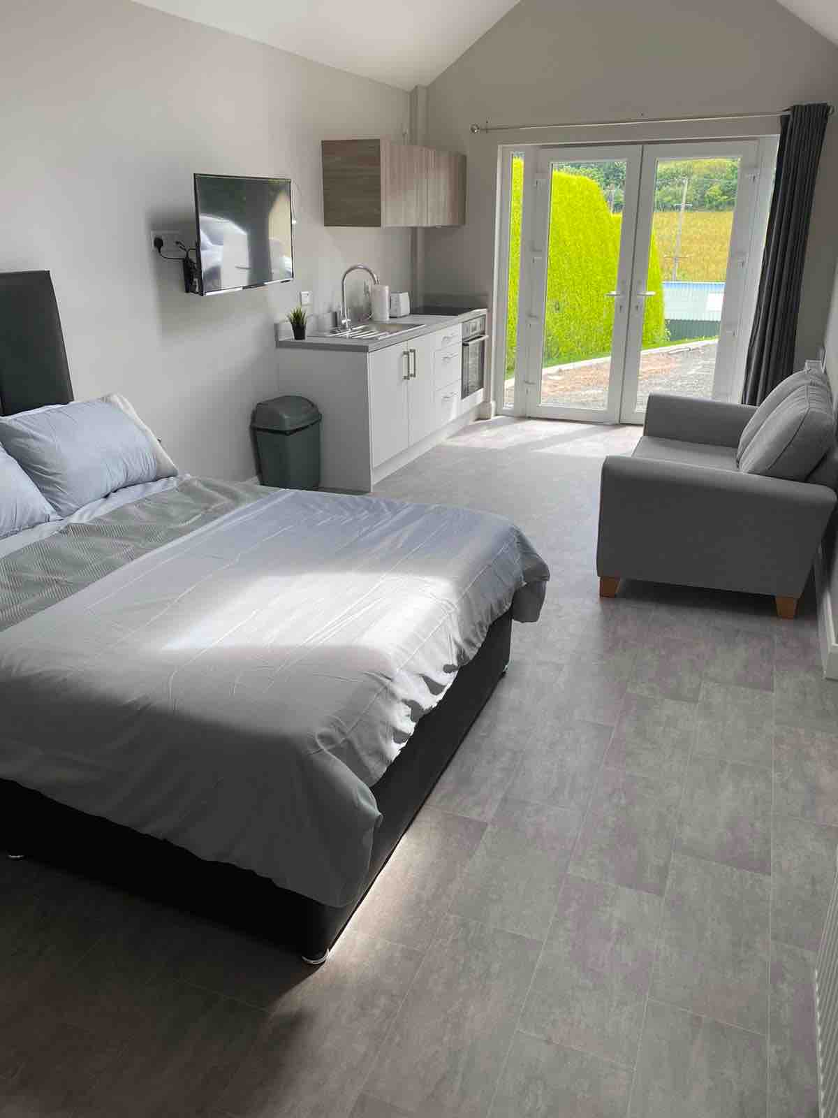 Studio indépendant flambant neuf avec vue imprenable sur la forêt. À 5 minutes à pied des bars, restaurants, du centre-ville de Ballycastle et de la forêt de Ballycastle. La plage est à seulement 15 minutes à pied. Le Forest Chalet est un superbe nouveau développement, construit selon les normes les plus strictes à l'été 2021. Il offre un parking gratuit, une salle de bains privative, une entrée privée, une cuisine entièrement équipée et une connexion Wi-Fi rapide par fibre optique. Capacité d'accueil de 2 adultes avec un lit de voyage disponible sur demande.