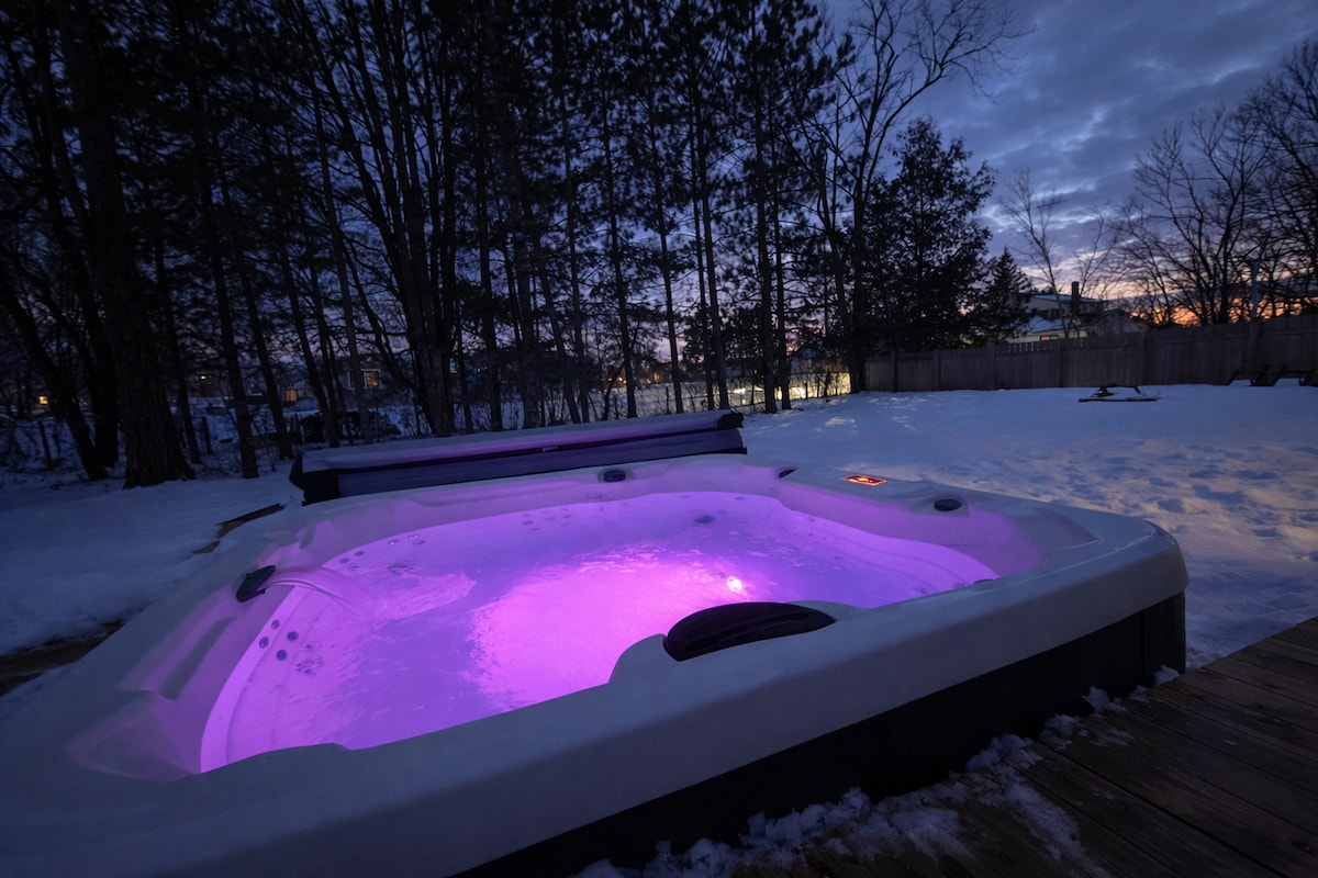 Bienvenue dans votre escapade de rêve sur les rives du lac Bass ! Cette cabane en forme de A rénovée est la retraite parfaite pour les couples et les familles, pouvant accueillir confortablement jusqu'à 7 personnes. Dès votre arrivée, vous serez entouré de beauté naturelle, de confort moderne et d'expériences inoubliables. • Détendez-vous dans le jacuzzi sous les étoiles. • Détendez-vous dans le sauna en forme de tonneau avec vue sur le lac • Faites griller des s'mores au coin du feu avec des chaises suspendues. • Regardez le match dans la pergola avec bar et télévision • Explorez le lac en kayak.