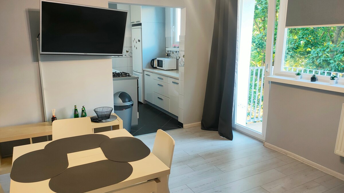 Un logement pour les personnes à la recherche d'un logement confortable. Dédié aux personnes qui arrivent en voiture, pour lesquelles nous avons deux places dans le garage dans le prix. L'appartement dispose de 3 chambres séparées et d'un salon avec télévision, d'une cuisine entièrement équipée (y compris une machine à café automatique) et d'un lave-linge séchant, particulièrement adapté aux familles avec enfants. À proximité immédiate de l'appartement, il y a: 20 ha de parc avec des attractions pour les personnes de tous âges, Biedronka, pharmacie, club de fitness, église.