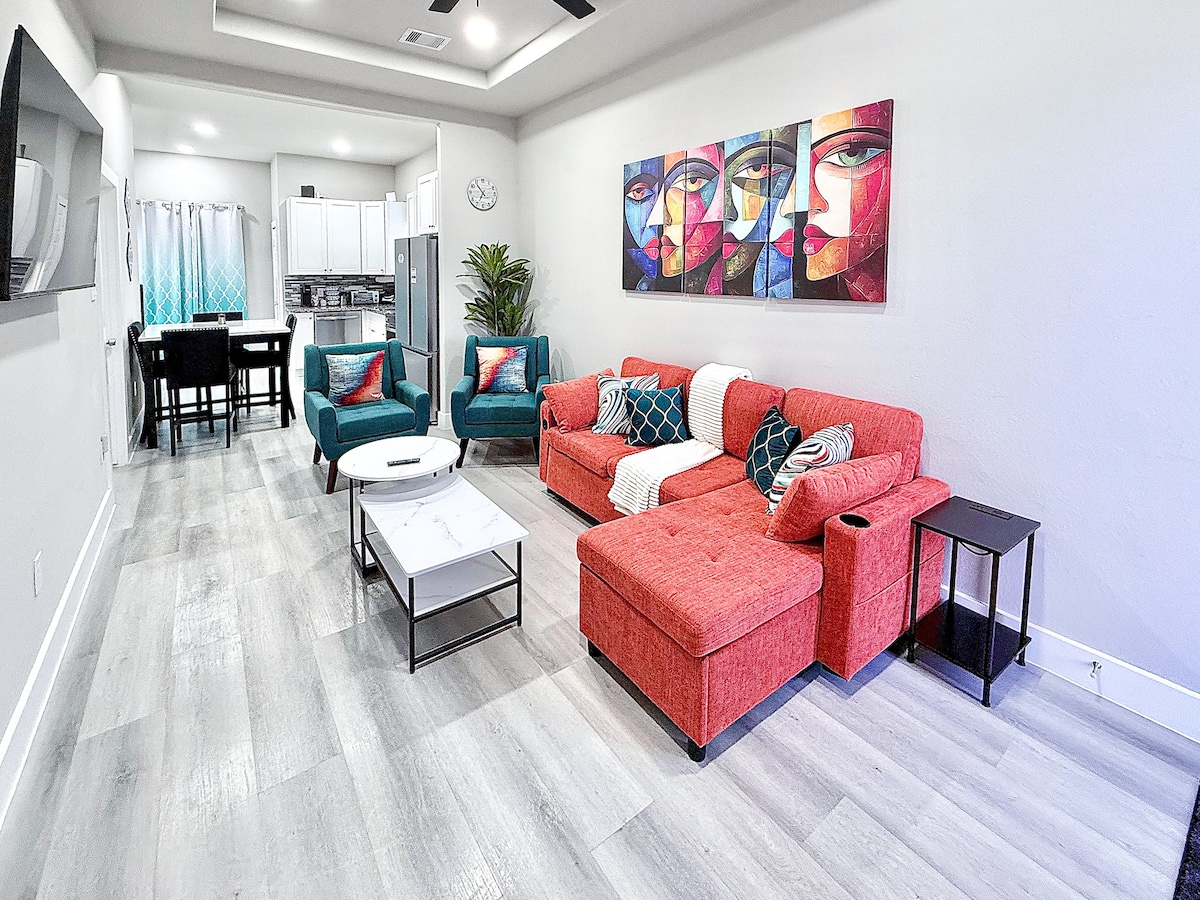 Séjournez à quelques minutes des principales attractions de Houston dans ce logement moderne de 3 chambres situé près du Texas Medical Center, du NRG Stadium, du centre-ville, du Hermann Park et du Museum District. Profitez d'une suite king size, d'une cuisine entièrement équipée, d'une connexion Wi-Fi rapide, d'un espace de travail, d'une télévision connectée de 65 pouces et d'un parking gratuit. Parfait pour les familles, les groupes, les voyageurs médicaux et les professionnels. Peut accueillir 8 personnes.
