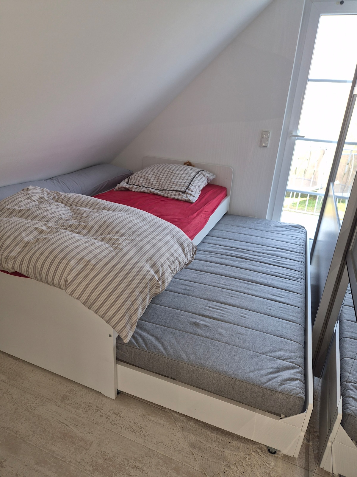 L'appartement est situé séparément dans une maison individuelle occupée en permanence à proximité du parc des expositions. Les transports en commun sont facilement accessibles à pied. En tramway, vous êtes en quelques minutes dans le centre-ville. L'appartement d'un total de 30 m2 est divisé en 3 pièces : Il y a 2 lits simples, une salle de bain privée et une pièce qui peut être utilisée comme salle à manger ou bureau. Il n'y a pas de cuisine.