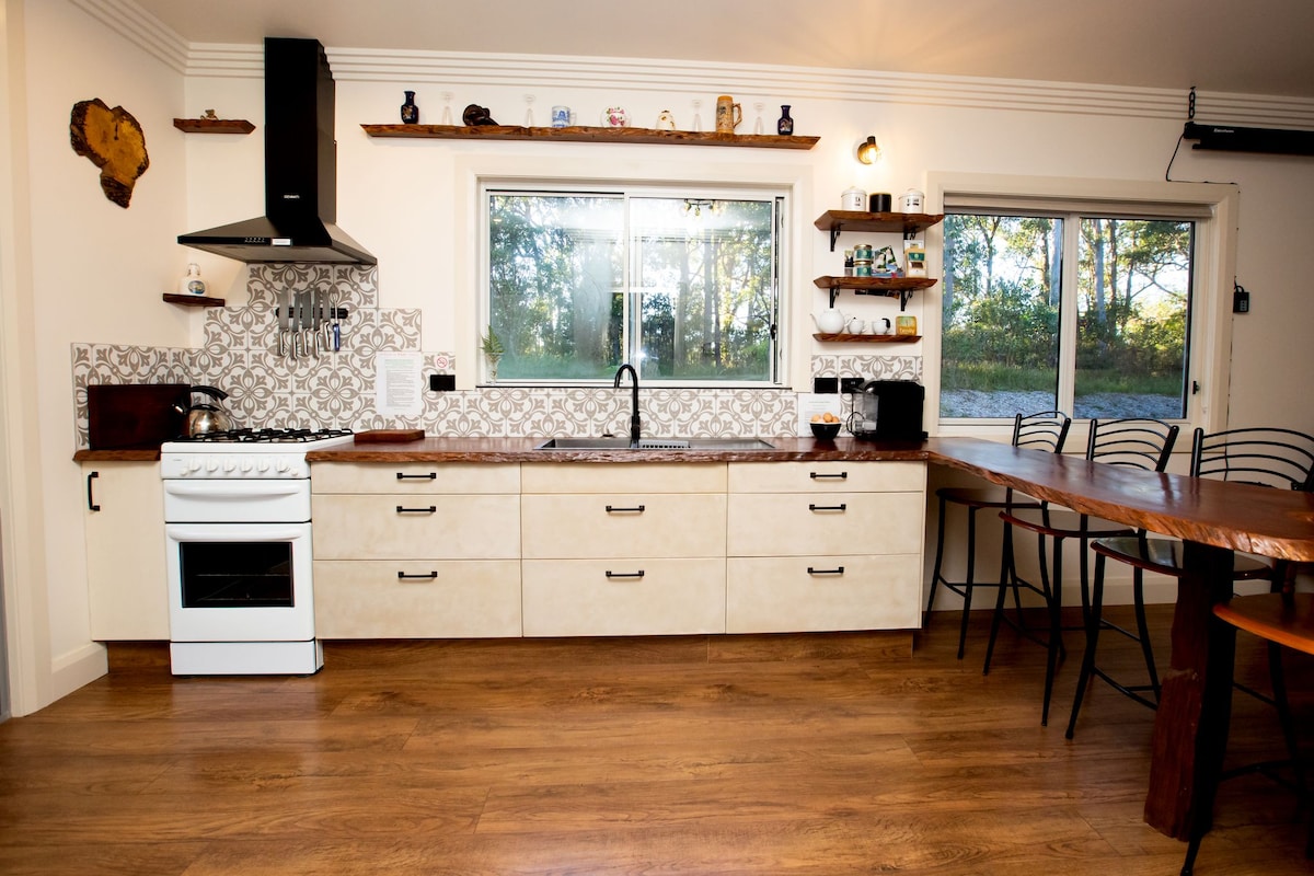 Rainbow Creek a été conçu pour les amoureux et les aventuriers. Niché au bord de la forêt tropicale à Kalang, vous êtes en immersion dans la nature : chants d'oiseaux, vers luisants et un million d'étoiles la nuit. Profitez d'espaces luxueusement confortables pour vous reposer ou soyez créatif dans la bibliothèque avec des fournitures artistiques ou lisez nos livres sur la nature et l'art dans la bibliothèque. Nous sommes assez loin de Bellingen pour avoir l'impression de vous être vraiment échappé, mais assez proches pour sortir dîner en amoureux ou prendre un petit déjeuner et un café le matin.
