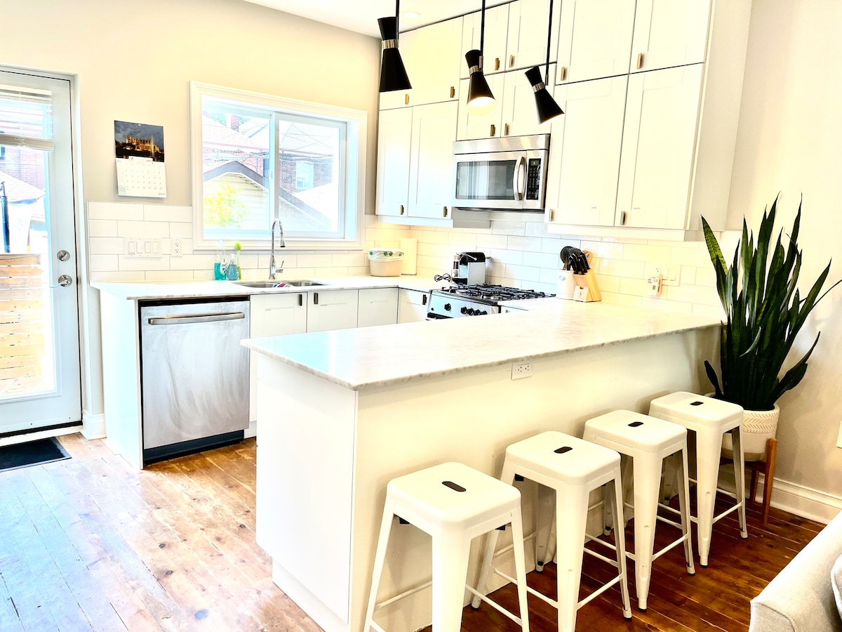 Maison de 3 chambres entièrement rénovée dans le quartier animé de St. Clair West. Aménagement lumineux et ouvert avec cuisine complète, jardin privé avec barbecue et véranda avec espace de travail dédié. Peut accueillir jusqu'à 7 personnes avec 3 chambres + canapé-lit au niveau inférieur. Marchez jusqu'aux meilleurs restaurants, magasins et transports en commun. Idéal pour les familles et les professionnels. Calme, élégant et entièrement à vous — le séjour parfait à Toronto.