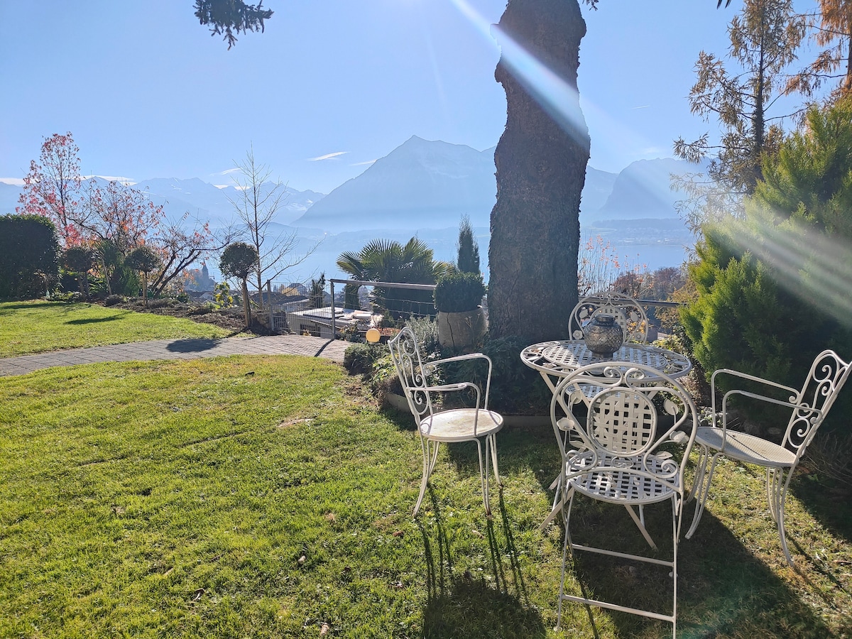 Chalet avec vue splendide sur les montagnes suisse et lac de Thoune à environ 900 mètres d'altitude dans la région de l'Oberland bernois Un jardin clos et 2 grande terrasse panoramique 1 haute ou vous pouvez manger faire manger faire un barbecue, prendre votre petit déjeuner, dîner en admirant la splendide vue ainsi qu'à l'intérieur dans la salle à manger au niveau de la chambre ou vous pourrez profiter de chaise longues et d'un whirlpool avec musique