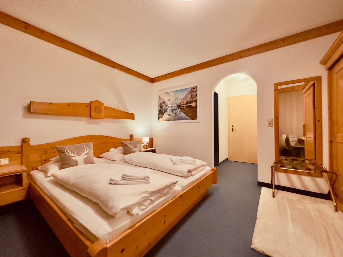 Profitez du meilleur des deux mondes : l'indépendance d'un appartement de vacances spacieux combinée aux avantages de notre hôtel familial avec jardin : espace bien-être, piscine extérieure chauffée avec éclairage sous-marin en été, accès gratuit à l'espace aquatique panoramique en hiver, café-bar gratuit et bien plus encore. Commencez la journée avec les rayons du soleil et une vue imprenable sur les montagnes. La forêt voisine vous garantit un air pur et beaucoup de calme.