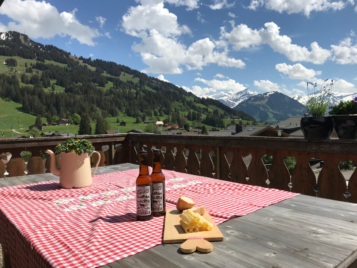 Balcon panoramique à Gstaad avec vue sur les Alpes