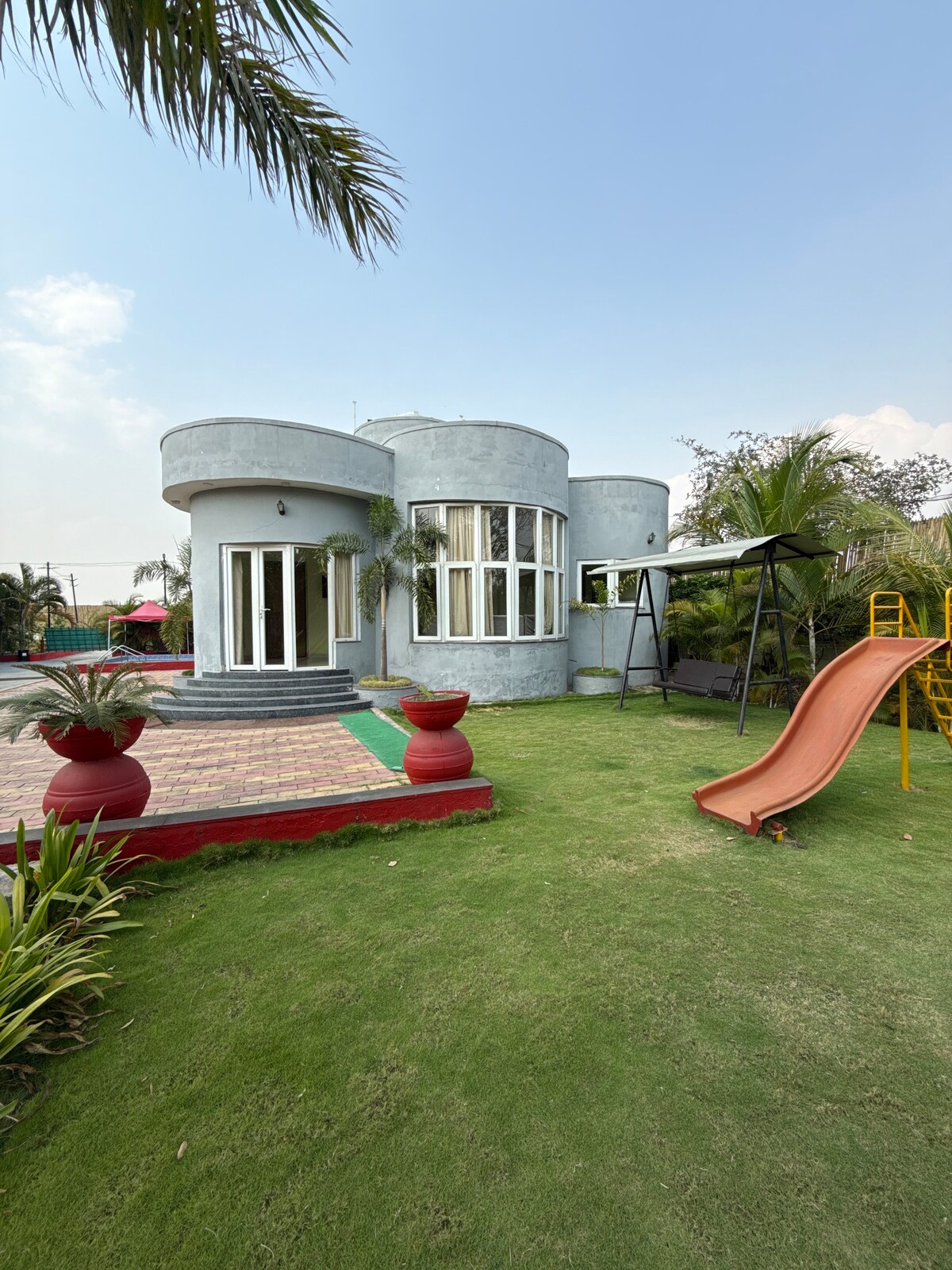 Cette belle maison en bois d'une chambre, faite de pin canadien importé, située près de l'aéroport sur la route VIP à Raipur, la capitale du Chhattisgarh, offre l'expérience d'être au Canada ou en Suisse. Elle dispose d'une magnifique piscine et d'une pelouse pour les fêtes. Cette belle maison en bois près de la ville vous fait vous sentir loin de la ville.