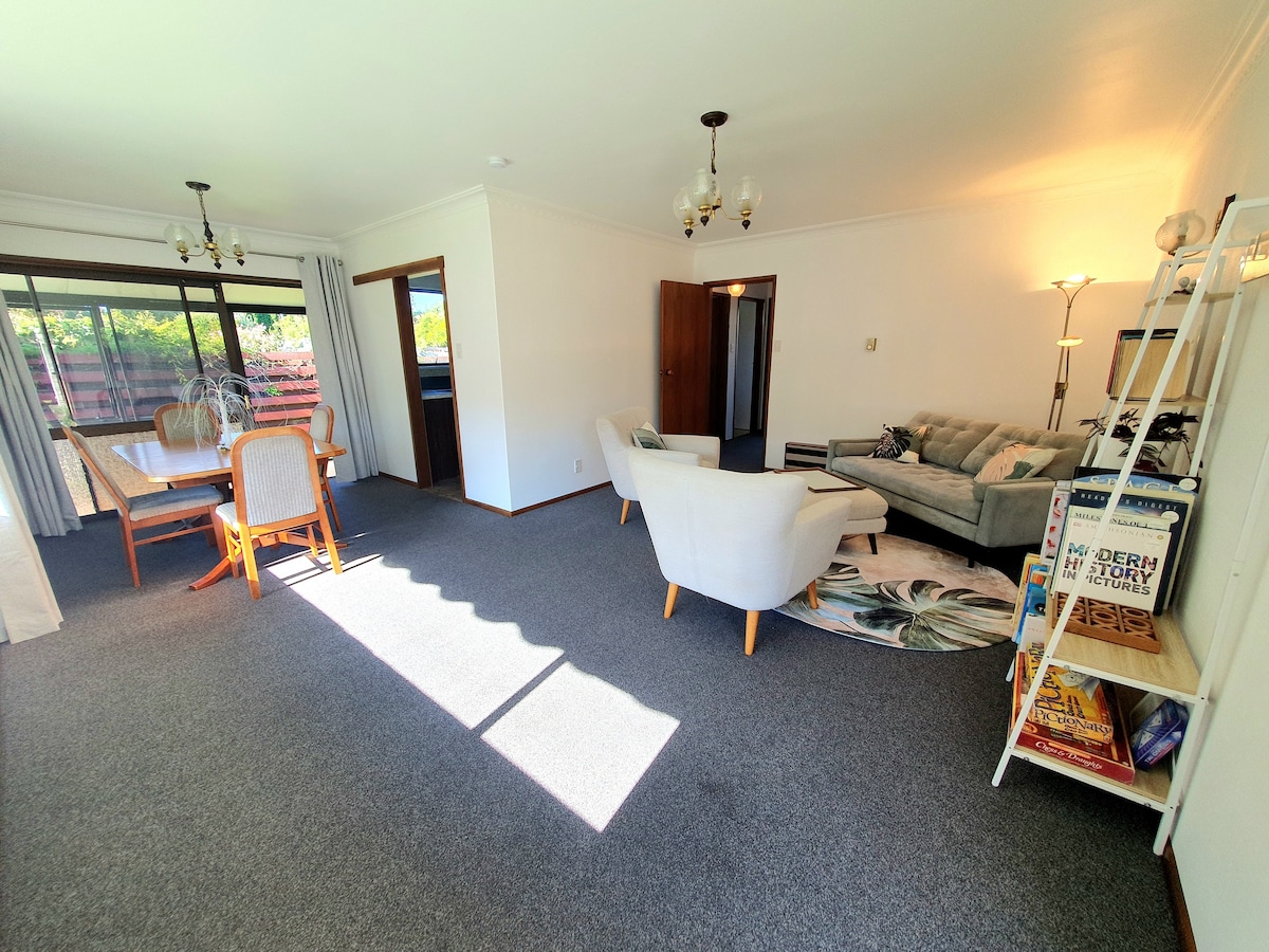 Venez vous détendre dans notre paisible banlieue, dans un garage double converti, idéalement situé par rapport à la plage locale, au centre commercial Bayfair, à la piscine Baywave et aux populaires Mount Maunganui Beach et Mercury Baypark. Les hôtes sympathiques sont sur place et disponibles pour recommander des cafés et des restaurants. Nos beaux chiens Olly et Stella apprécient les caresses. Chambre supplémentaire dans un conteneur disponible uniquement pour les réservations de 3 voyageurs ou plus. Des réductions à la semaine et au mois s'appliquent. Plaques chauffantes récemment ajoutées et barbecue extérieur disponibles sur demande.