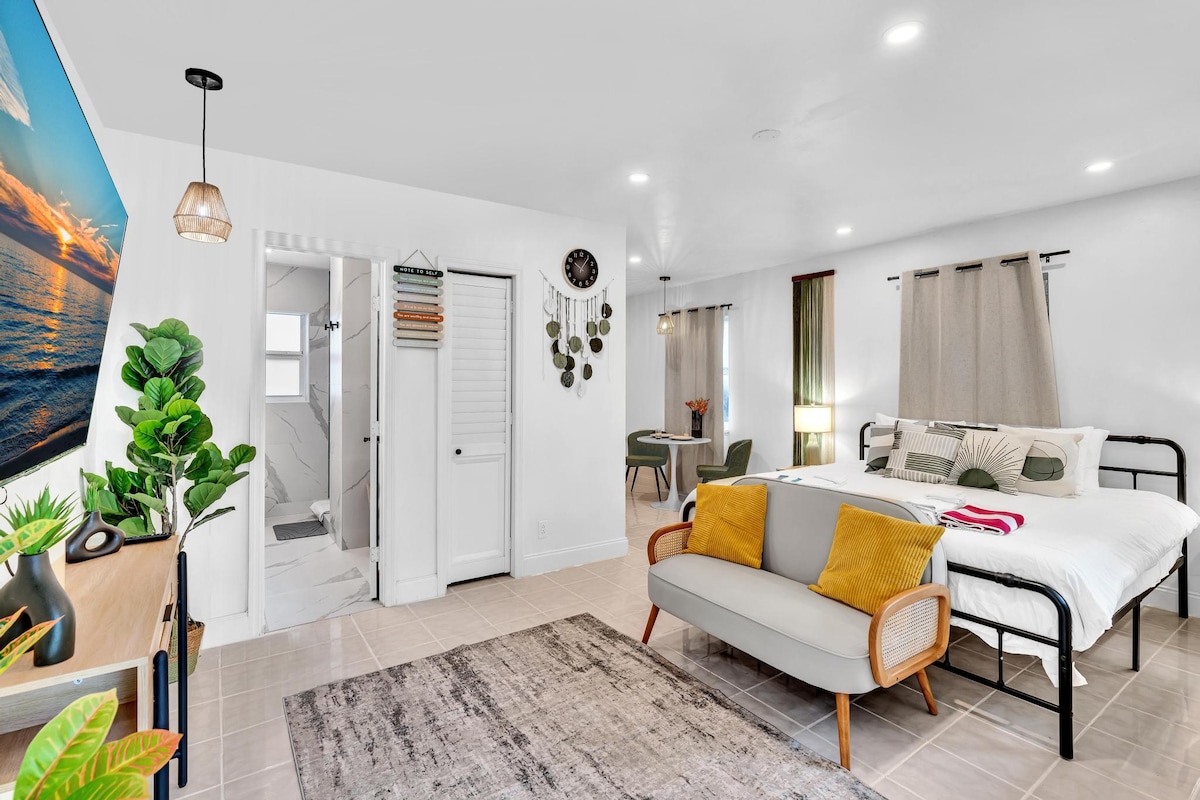 Il s'agit d'une retraite moderne du milieu du siècle récemment rénovée au cœur de Pembroke Pines. Ce studio confortable est idéal pour les séjours courte durée, avec une cuisine complète, une salle de bain magnifiquement rénovée et un salon spacieux. Détendez-vous dans un lit Queen Size confortable et un futon qui s'ouvre sur un lit double. Comprend du café gratuit, des articles de toilette, une connexion Wi-Fi rapide et une télévision intelligente avec des applications de streaming. Plongez dans le confort et le style dans cet espace accueillant de la ville animée de Pembroke Pines.