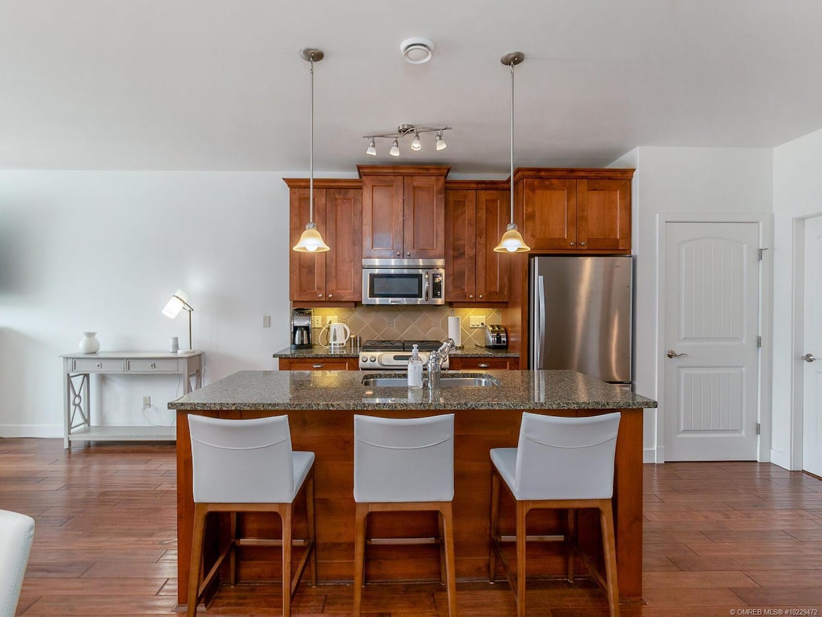 Licence commerciale valide jusqu'en 2026 Piscines int. et ext. 2 chambres (2ème chambre convertie d'un salon) 1 salle de bain avec douche Cuisine rénovée avec appareils électroménagers en acier inoxydable et plans de travail en granit 2 balcons orientés est et ouest Wifi et Téléviseur Telus avec Crave et HBO + Chromecast Espace de travail adapté aux ordinateurs portables avec moniteur Lave-linge et sèche-linge Machine à café et expresso 1 place de parking en sous sol Emplacement central au bord de l'eau dans le centre-ville de Kelowna