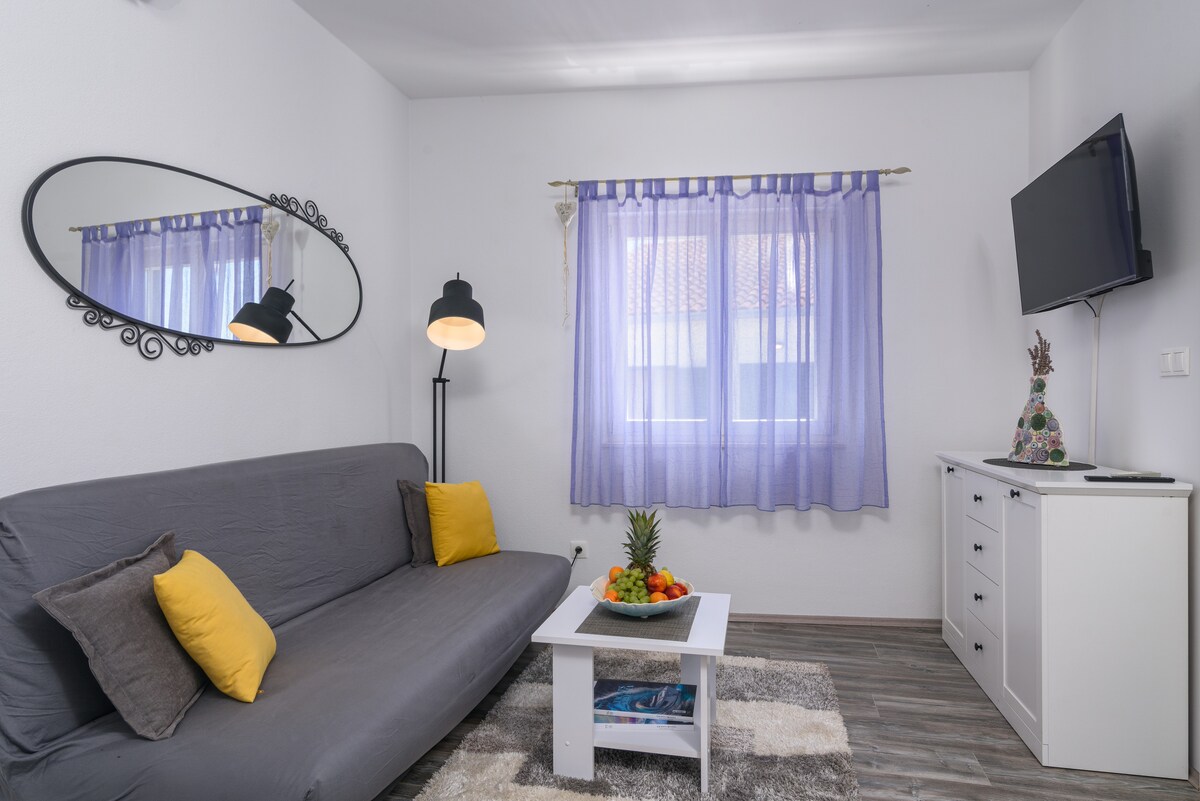 Cet appartement se trouve au 2ème étage de la Villa avec 3 ap., qui se trouve à environ 200m de la plage, du restaurant et de la boutique, et à 800m du vieux centre (protégé par l'UNESCO) de Trogir. Dispose de 2 pièces, d'un salon et d'une grande terrasse devant idéale pour se détendre
