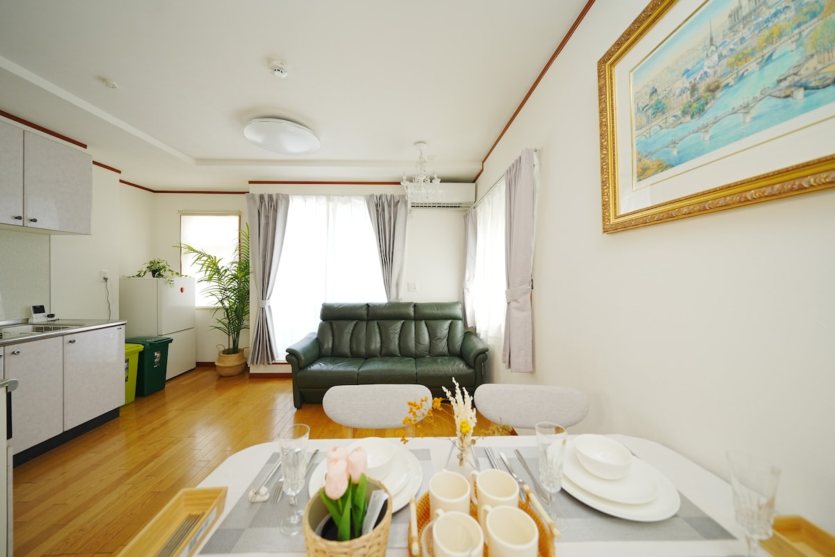 Nous offrons un espace de détente au cœur de la ville. Cette chambre peut accueillir jusqu'à 4 personnes avec 2 lits doubles, parfaite pour les couples, les familles ou les petits groupes. Le linge de lit aux accents verts et le parquet en bois naturel créent une atmosphère apaisante et confortable. Profitez d'une télévision de 55 pouces pour les soirées cinéma, du Wi-Fi, d'une cuisine IH et d'un lave-linge, idéal pour les séjours longue durée.