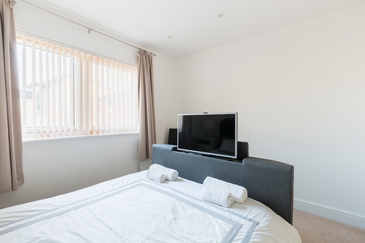 Un bel appartement nouvellement construit au bord de la rivière à la frontière du spa Royal Leamington idyllique et de la ville historique de Warwick Town 1 chambre avec télévision king size et salle de bains privative dans la chambre principale de cet appartement de deux chambres pour une occupation complète de l'appartement. Cuisine moderne entièrement équipée équipée et équipée d'appareils SMEG. L'appartement offre une deuxième salle de bain moderne. Le salon est équipé d'un canapé inclinable électrique pour votre détente pendant que vous profitez de votre programme ou film préféré sur une télévision connectée avec les services Sky. WIFI.