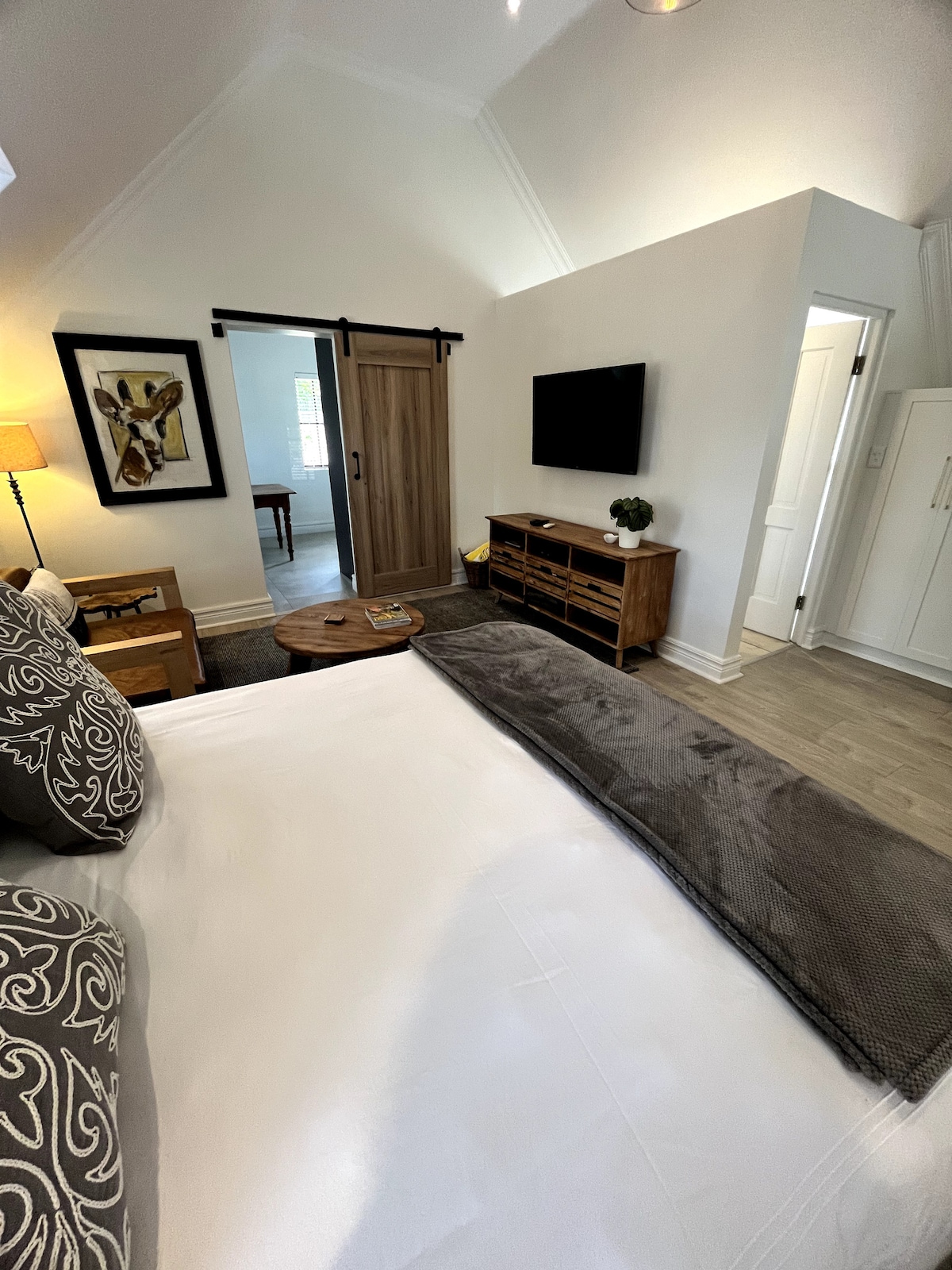 Cet appartement lumineux est entièrement privé avec sa propre entrée, séparée de la maison principale, parfaite pour la paix et la tranquillité. À l'intérieur, vous trouverez une chambre confortable avec une salle de bain attenante, ainsi qu'un salon spacieux avec un coin repas et une kitchenette pour votre confort. L'appartement est alimenté par l'électricité de secours solaire et un geyser solaire, de sorte que vous pouvez profiter d'un séjour confortable sans les tracas de délestage. Nous partageons notre logement avec deux chiens et un chat, des animaux de compagnie qui aiment les gens.