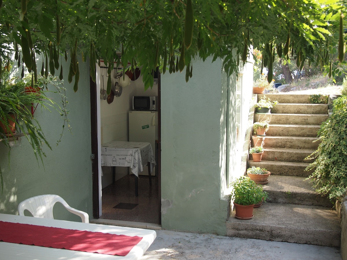 La nôtre est une petite maison dans un jardin verdoyant et ombragé avec une table et des chaises pour les repas à l'extérieur. Il est pour deux adultes plus deux enfants ( ou pour trois adultes). Un chien ou un autre animal de compagnie est le bienvenu. La maison n'est pas exactement moderne ou luxueuse, mais elle est simple, bien rangée avec une atmosphère chaleureuse - très confortable. À trois minutes à pied se trouve la plage de sable de Slanica. De belles plages rocheuses sont également à proximité. Nous sommes une famille sympathique à côté, avec deux enfants (15, 17) - et deux chats. Bienvenue !