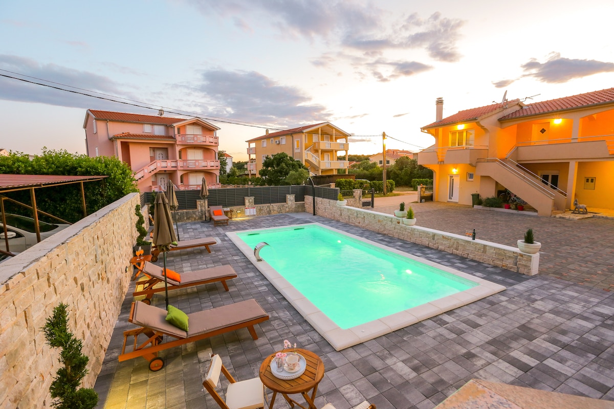Détendez-vous dans ce logement confortable et bien aménagé. L'appartement Maky est à 5 minutes à pied de la mer, ainsi que du centre-ville. Détendez-vous sur notre balcon avec un jacuzzi moderne, un verre de champagne et une vue sur les étoiles. Le parc aquatique Dalmaland se trouve à 3 minutes en voiture de notre appartement, et Zadar se trouve à 25 minutes en voiture. L'appartement vous accueillera équipé d'appareils tels qu'un lave-linge/sèche-linge, une cafetière Dolce Gusto, des sèche-cheveux, un fer à repasser, le Wi-Fi, des climatiseurs, une télévision connectée...