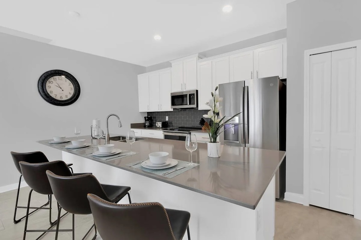 À quelques minutes de Disney, maison de ville élégante et paisible, avec 4 chambres et 3 salles de bain complètes, cuisine entièrement équipée pour jusqu'à 8 personnes, située dans le complexe hôtelier familial Storey Lake. Profitez de notre piscine privée avec chauffe-eau en option. Le plan d'étage ouvert combine cuisine, salle à manger et salon. À proximité des centres commerciaux et des magasins de détail. Excellents équipements du complexe hôtelier : piscines chauffées, zone de jeux pour enfants, toboggans aquatiques, rivière paresseuse, salle de sport, mini-golf, lac, kayak, bar Tiki, glacier et plus encore.