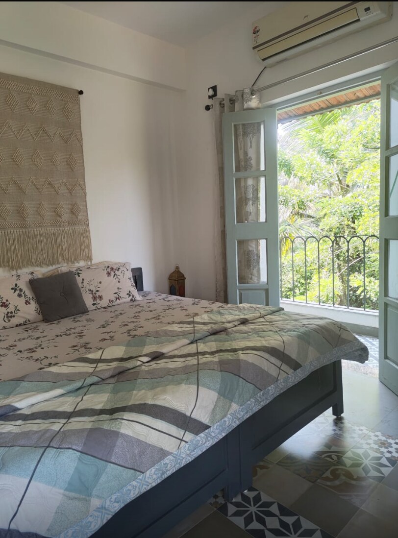 Parfait pour les couples et les célibataires à la recherche de tranquillité à Isavyasa Retreats ! Évadez-vous dans notre studio « serein », avec une terrasse personnelle pour une vue imprenable sur le coucher du soleil et un accès privé à la plage. Découvrez l'architecture indo-portugaise dans une communauté sécurisée avec piscine. Les travailleurs à distance bénéficient d'une connexion Wi-Fi haut débit, d'une alimentation de secours, de la climatisation, d'un four à micro-ondes et d'une kitchenette entièrement équipée. Ce refuge romantique dispose d'un sol en mosaïque exquis, de fenêtres en coquilles d'huîtres et de carreaux Azulejo qui vous transportent dans une époque oubliée.