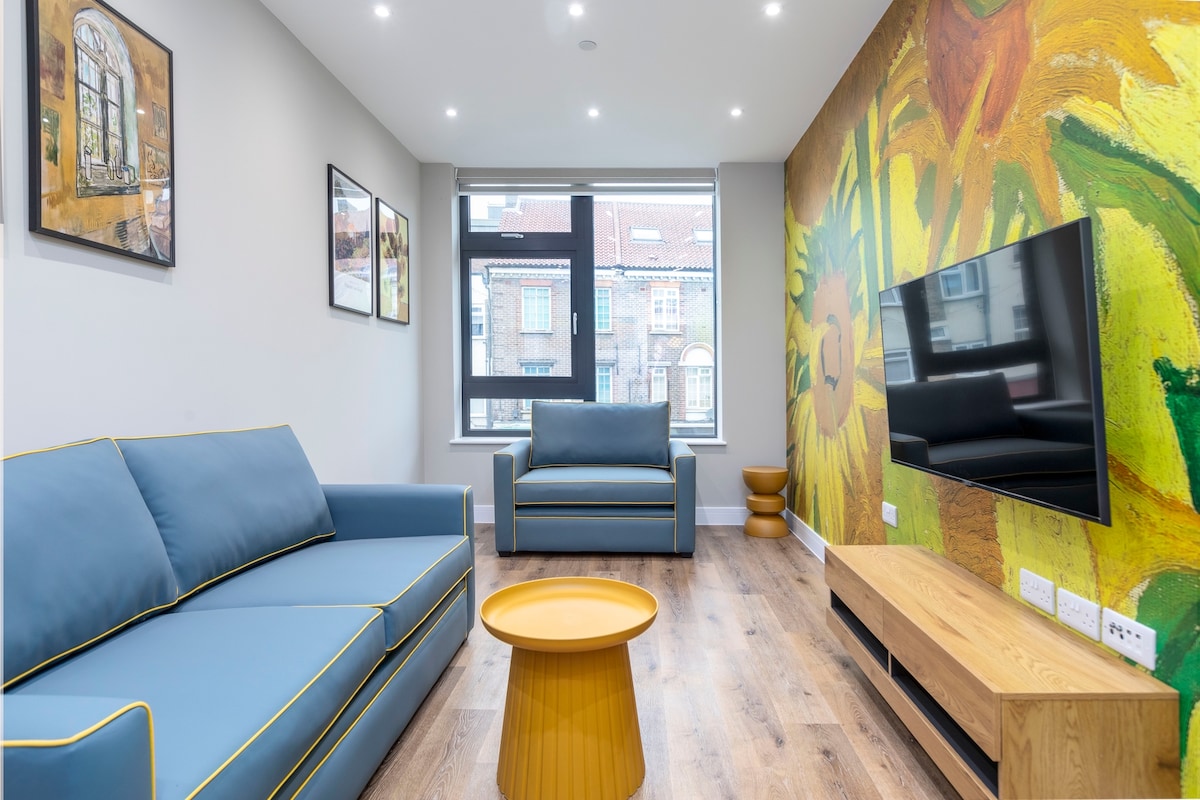 Appartement unique de 2 lits et 2 salles de bain à Orpington, récemment rénové dans le style dynamique de l'artiste Van Gogh ! Lumineux, spacieux et plein de couleurs, cet appartement haut de gamme dispose d'une cuisine entièrement équipée, d'un salon aéré et d'un charme artistique. Situé dans un bâtiment moderne avec ascenseurs et parking gratuit, vous profiterez également de la climatisation, d'une connexion Wi-Fi rapide, de lits Super-King, d'un jacuzzi et d'un accès aux espaces partagés comme une salle de sport et une salle de conférence. Idéal pour les voyageurs à la recherche d'un séjour élégant et confortable !