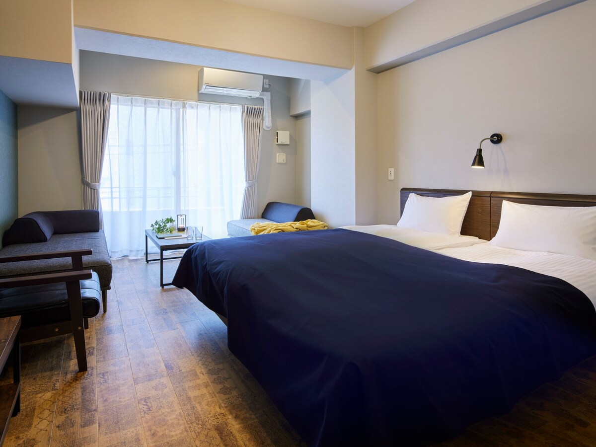 Une pièce où vous pouvez voir Tsutenkaku depuis la fenêtre ! Appartement de luxe neuf C'est un endroit pratique pour faire du tourisme car les lignes de métro, JR et Nankai le traversent ! Tsutenkaku, Spa World, Abeno Harukas, le zoo de Tennoji, Dotonbori, Namba, Shinsaibashi et le marché de Kuromon sont également à proximité. Don Quijote est à 5 minutes à pied. Check-in/check-out autonome pratique. La chambre dispose de 1 canapé-lit, 1 lit Queen et 1 lit simple, chacun avec climatisation et chauffage.