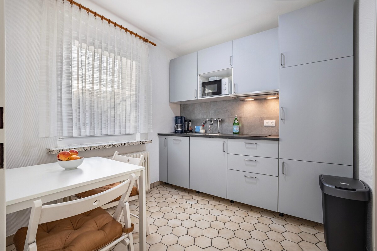 Tu emménages dans un appartement indépendant avec salle de bains et kitchenette dans ma maison dans un endroit calme sur le mur extérieur de la ville. Une machine à café entièrement automatique, un four à micro-ondes, une plaque de cuisson dominante et un réfrigérateur-congélateur font partie de l'équipement de la cuisine, tout comme la vaisselle pouvant accueillir jusqu'à 6 personnes. L'appartement confortable et moderne est situé au rez-de-chaussée et dispose de son propre accès au jardin.