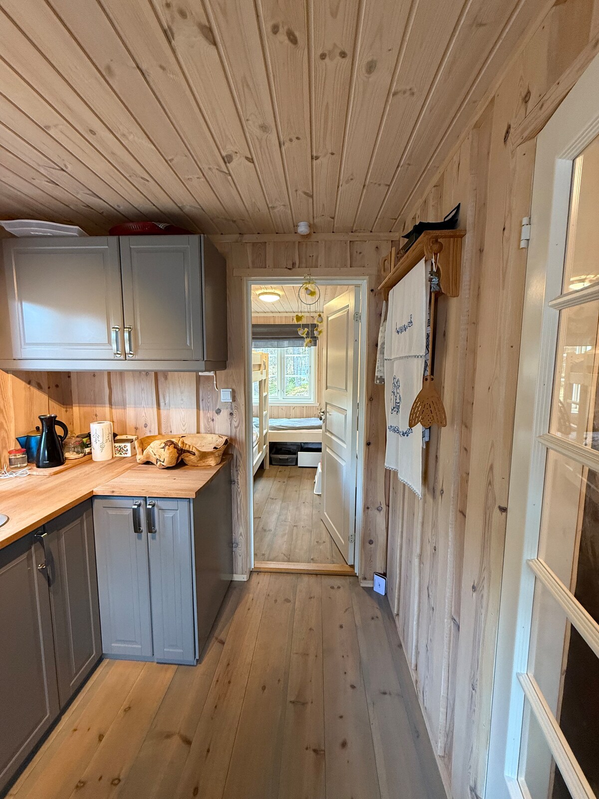 Cozy cottage by the sea with a view of the Hardangerfjord. The cabin has a 60s interior with its own warm atmosphere. Well equipped kitchen. Kitchen and living room in the same room. Bathroom with underfloor heating. Bedroom 1 has a double bed. Bedroom 2 has a single bed. Bedroom no. 3 has 2 single beds and a separate entrance from the terrace. Morning sun in the cabin wall to the east. Terrace to the west. You can drive to the door. The cabin is suitable for a family, couple or friends.