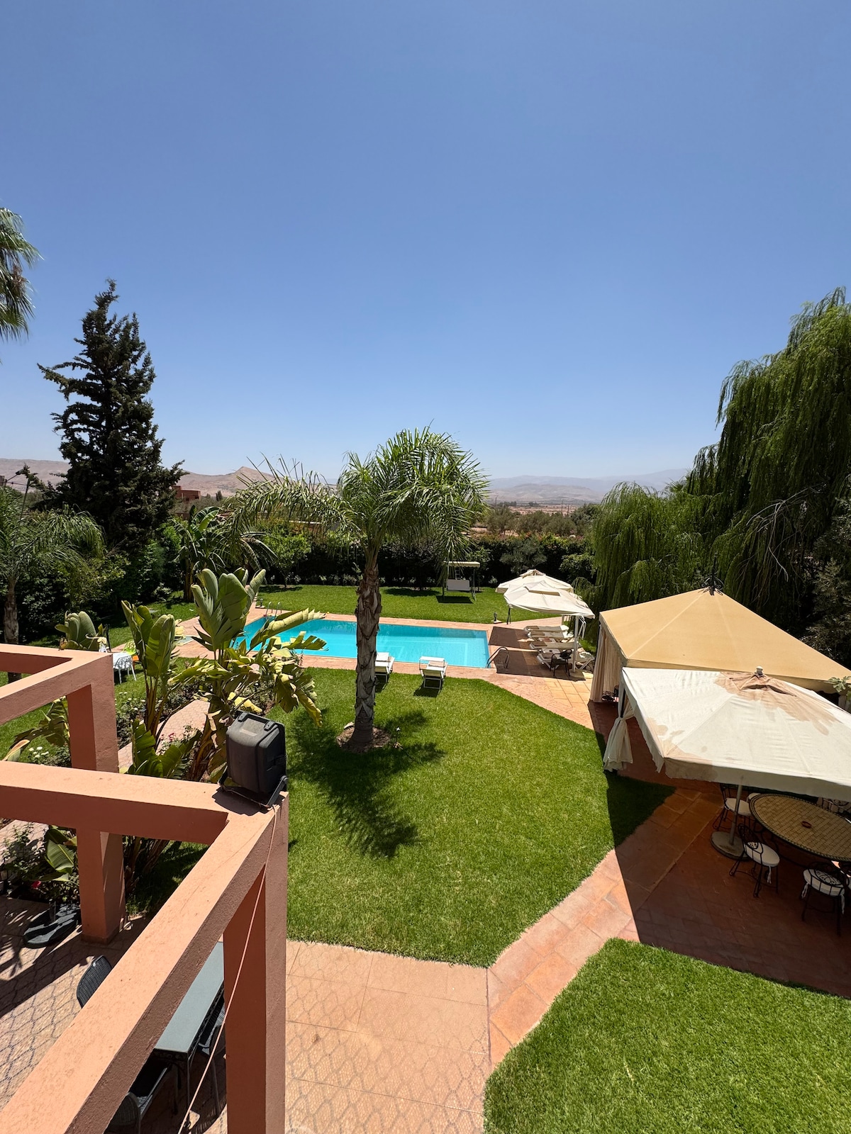 Grande maison avec Piscine, pour se retrouver en famille ou entre amis, jusqu’à 13 personnes. En toute tranquillité. Gardiens sur place à votre disposition . Il y a 5 chambres et 4 salles de bain , une cuisine , un grand espace salon intérieur avec une grande cheminée et un grand espace repas l hiver . Espace repas également dans le jardin l été . Piscine chauffée sans supplément. Une grande terrasse panoramique d où l on peut voir la chaîne de l atlas et le coucher de soleil .
