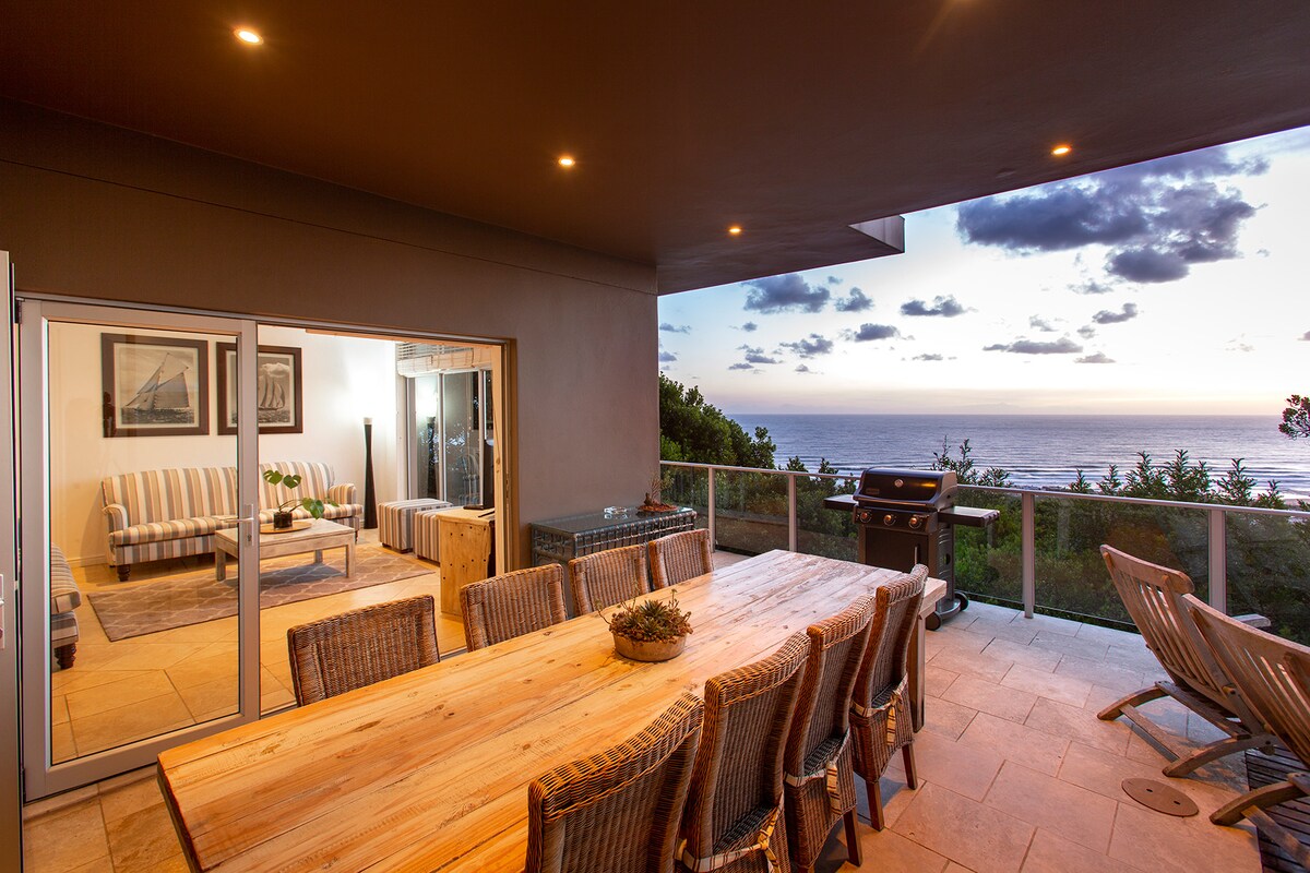Découvrez le style de vie côtier ultime dans notre maison de luxe au sommet d'une falaise avec une vue imprenable sur l'océan depuis chaque pièce. Notre design moderne biologique comprend du bois naturel et des meubles design. Plongez dans notre piscine semi-chauffée, ou profitez de notre terrasse de yoga et de détente ou cuisinez un repas dans notre cuisine design. Complet avec système d'énergie solaire et situé dans une réserve naturelle privée. À seulement 25 minutes de l'aéroport George, 15 minutes du centre commercial Garden Route et de Wilderness. Venez vous détendre dans le confort et le style.