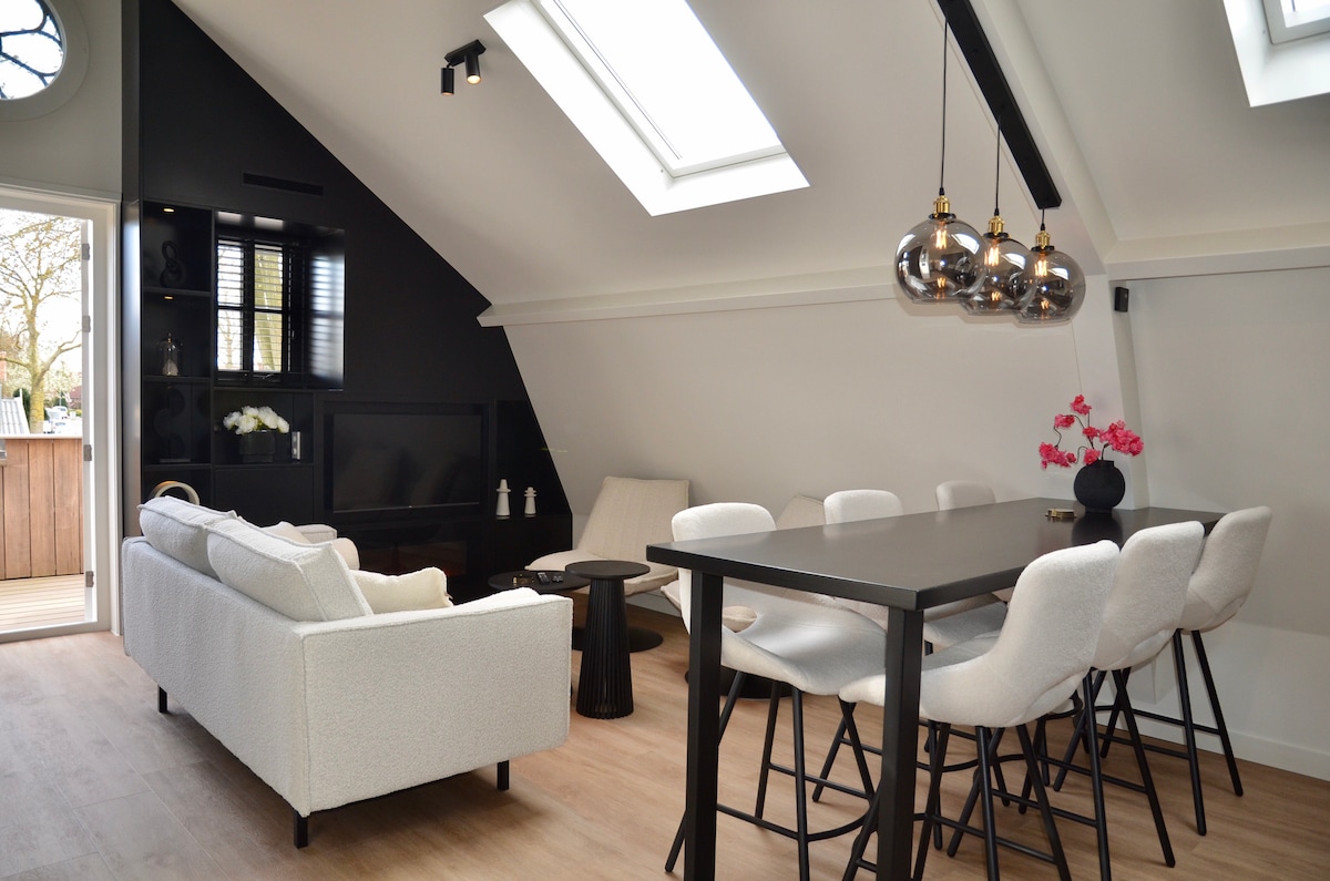 Lodge de luxe moderne entièrement neuf avec sauna. Profitez de la paix et de l'espace depuis le salon et la terrasse avec vue dégagée sur le moulin. Détendez-vous dans votre sauna privé et rafraîchissez-vous à l'extérieur sur la terrasse. Y compris l'utilisation de serviettes de bain et de peignoirs. À distance de marche, vous pouvez commander de la nourriture au restaurant de Molenschuur. Le Lodge est proche du centre d'Alkmaar et de la plage de Bergen ou d'Egmond. Promenez-vous également dans les dunes de Schoorl.